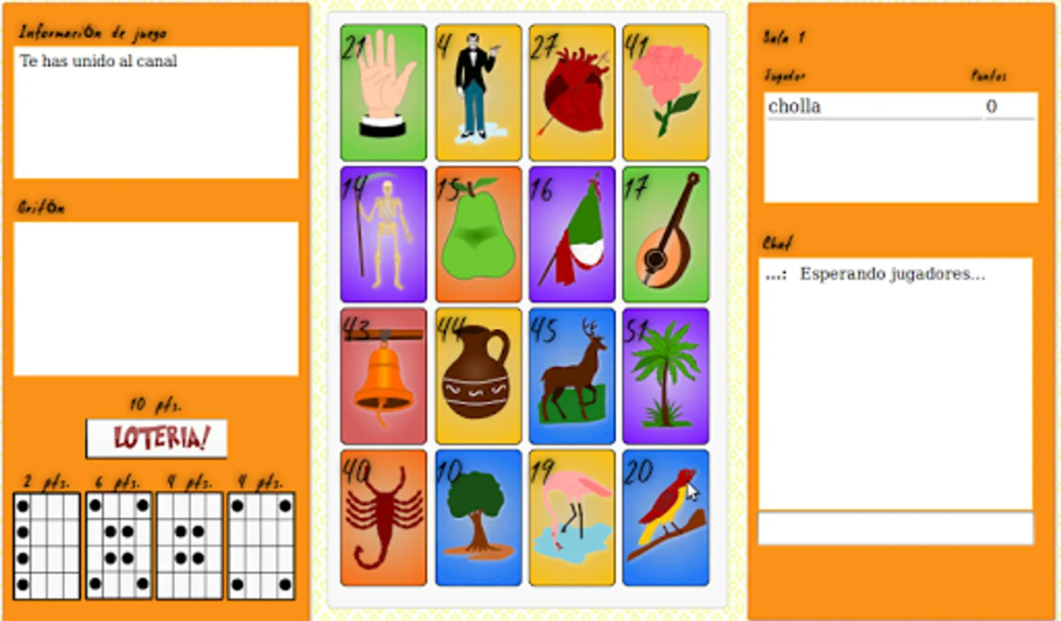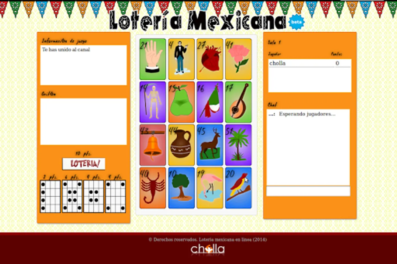 Loteria Mexicana online (Mexican bingo online), play against other players, get points claiming bonuses like: Chorro, Equis, Cuatro esquinas and Centro.