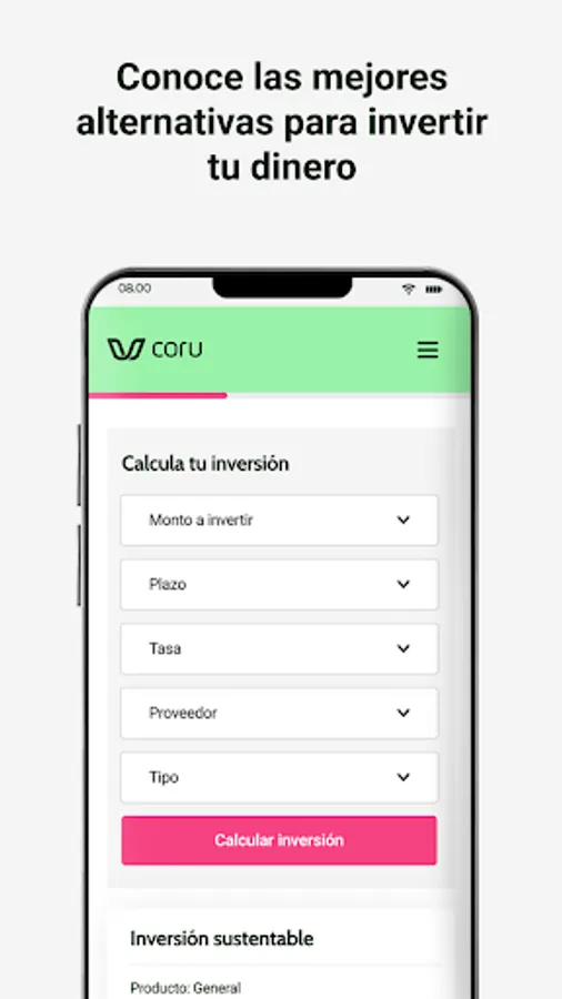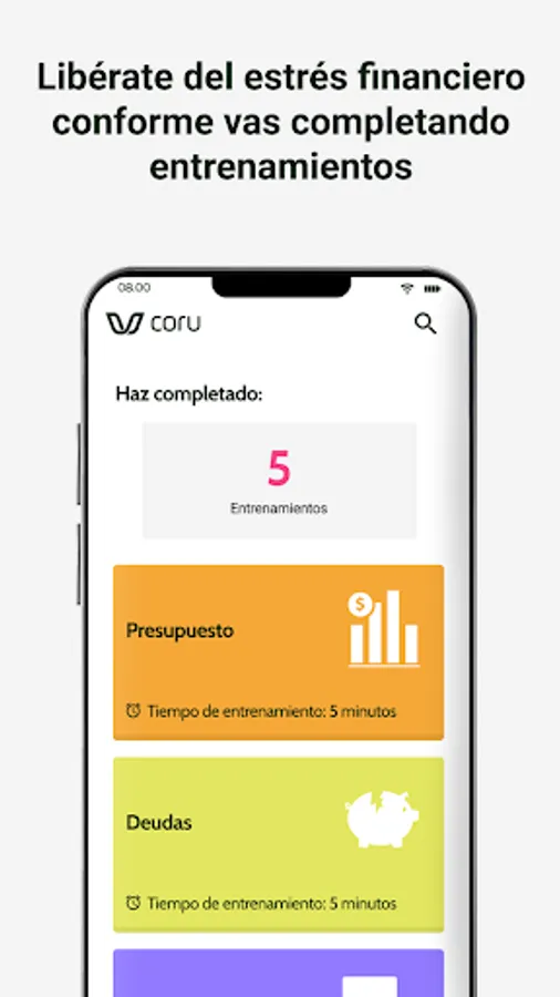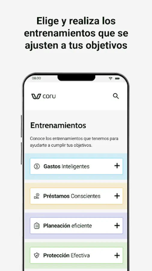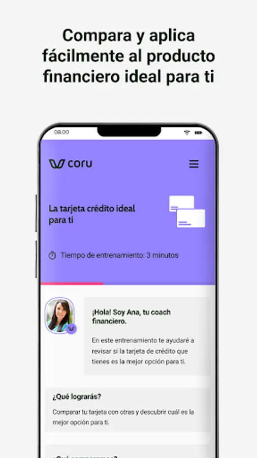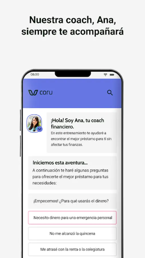 It does not matter if you want to go on a trip, create a business or eliminate your debts. Coru will help you through Ana, our virtual financial coach, to choose the easiest and simplest way to meet your goals.