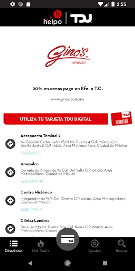 The TDU Helpo application has a very friendly interface, easy to use and access. The establishments are organized in an alphabetically ordered list. In addition, it allows you to search according to the name of the establishment, locate the address of each branch through Maps, Google Maps and Waze, dial the corresponding phone number and go to its website with a single click.