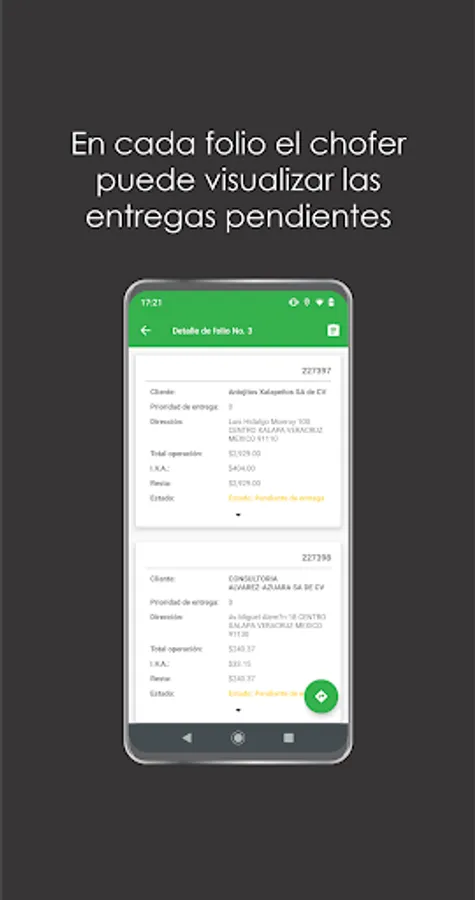 To improve the performance of the driver, the application displays on its main screen the list of pages assigned to the day. These pages include the orders (merchandise) that must be delivered to the addresses according to the configuration made by SIRE.