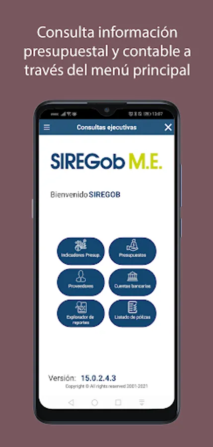 SIREGob ME (Executive Module) may request permissions for internet access, notifications and storage on the device to make a Wi-Fi / data connection, receive notifications and download the reports generated within the same application.