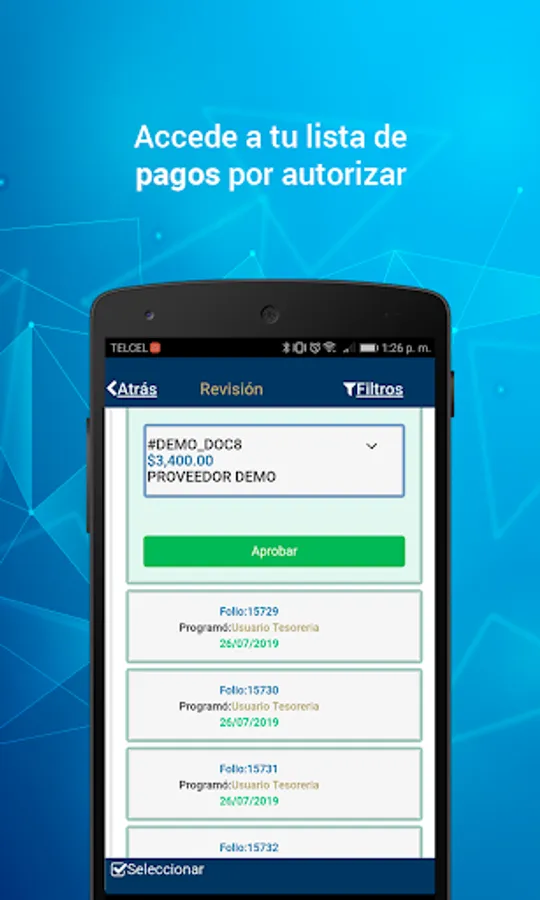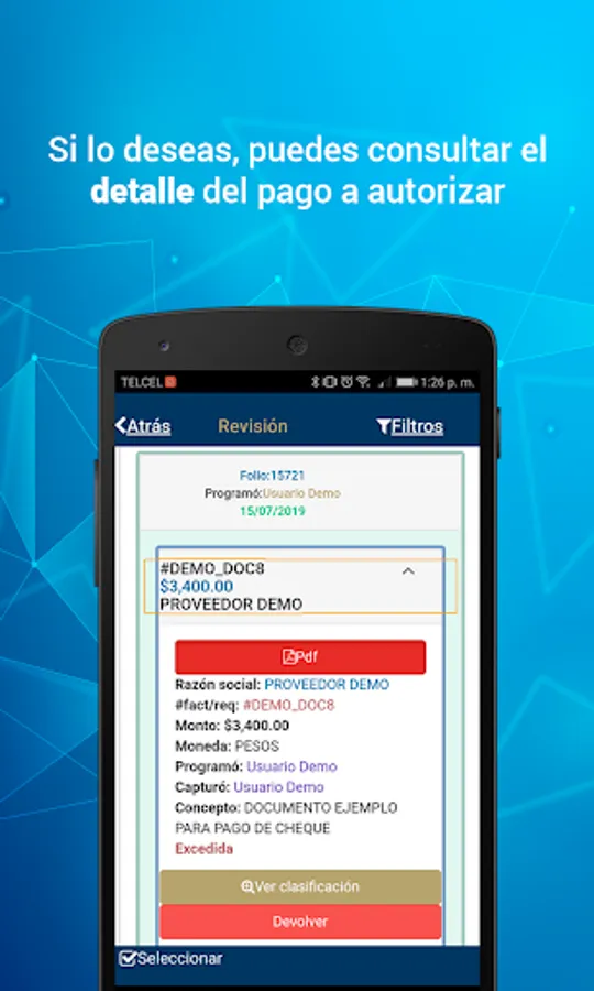 1.- Folios Review: Allows you to review and authorize folios that contain invoices or documents to pay. A sheet can contain 1 to n invoices or documents.