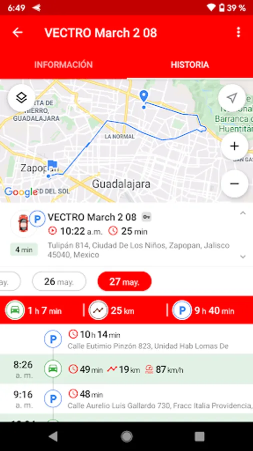 vehicle stops, with the route of the same. Information