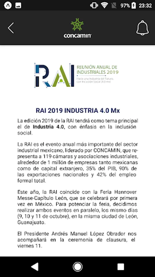 RAI is the most important annual event of the Mexican industrial sector, led by CONCAMIN, which represents 119 chambers and industrial associations, about 1 million Mexican and foreign capital companies, 35% of GDP, 90% of national exports and 42% of total formal employment.