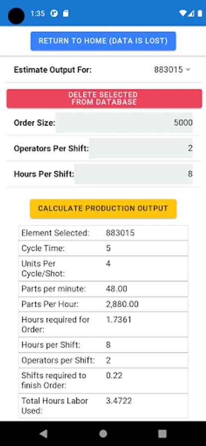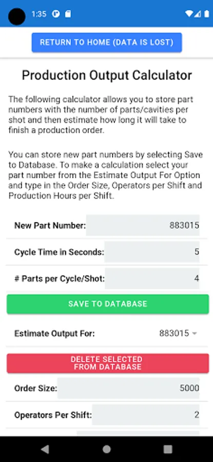 6. Estimate Production Output and save part numbers on your phone local Database (Persistent Storage even if you turn off your phone).