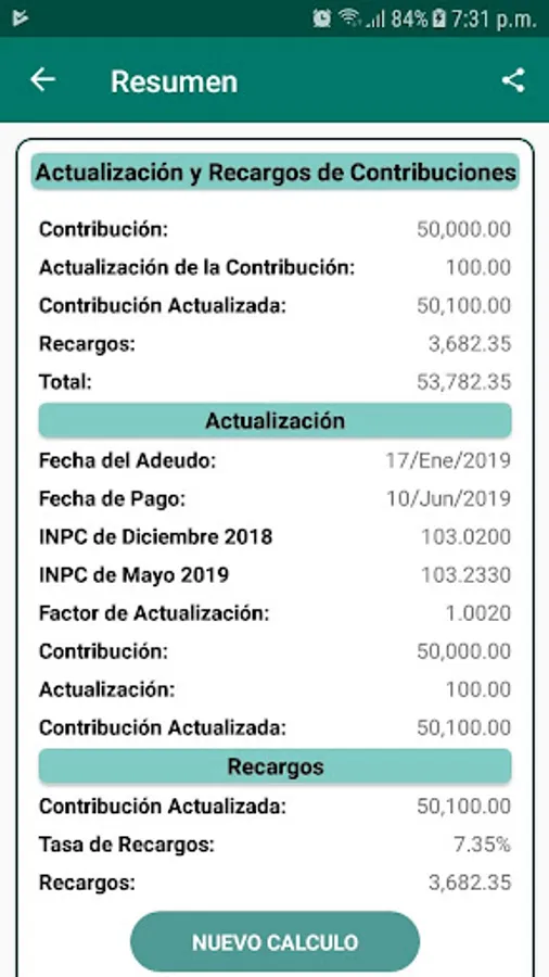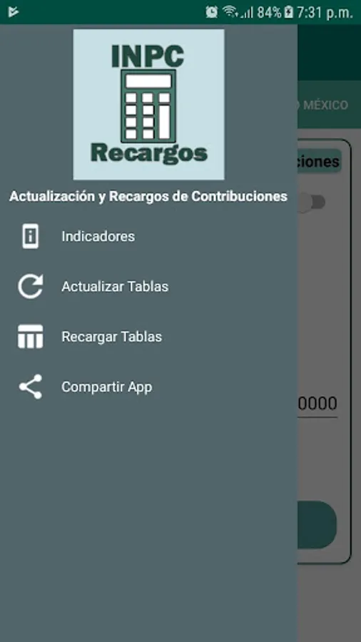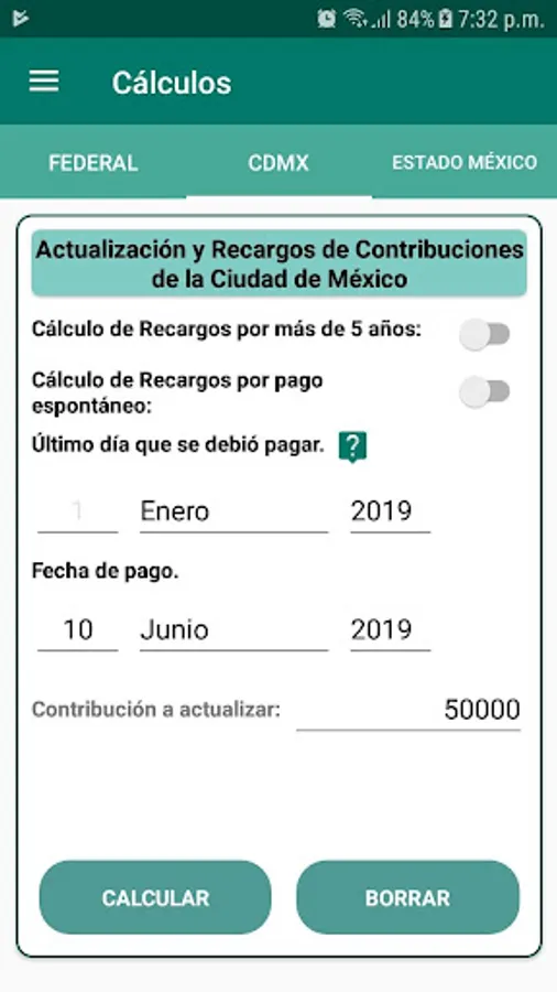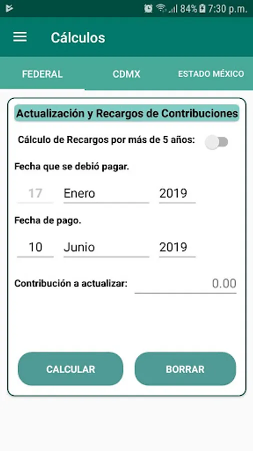 The App has three sections, in which you can make updating calculations and surcharges for federal contributions, from Mexico City and the State of Mexico.