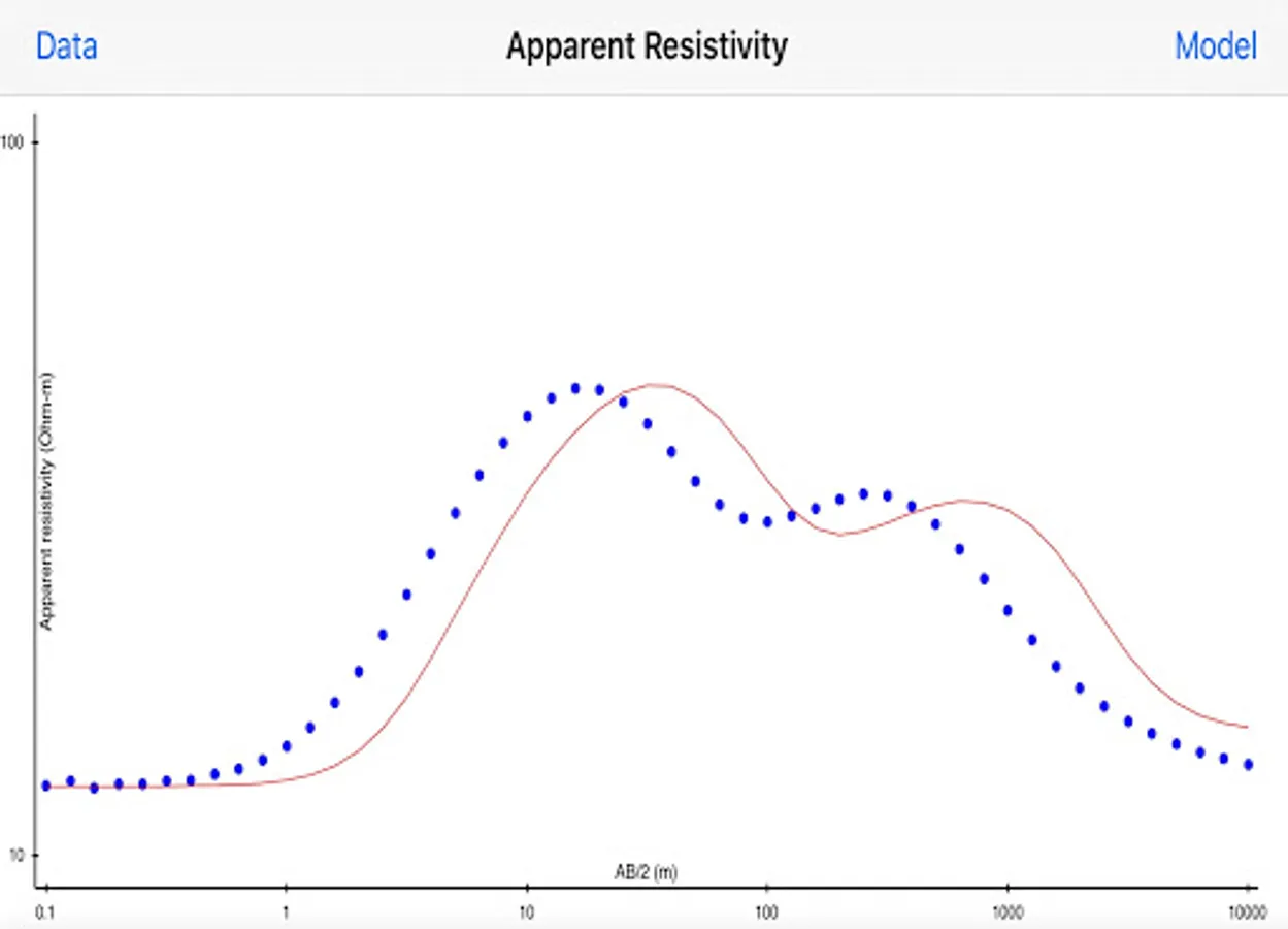 This App calculates the Apparent Resistivity for a stratified subsurface. It uses an input file of observed apparent resistivity data taken at the field and calculates the apparent resistivity from a proposed terrain model. This App shows an scatter plot of the observed apparent resistivity data and the apparent resistivity calculated from the theoretical terrain model.