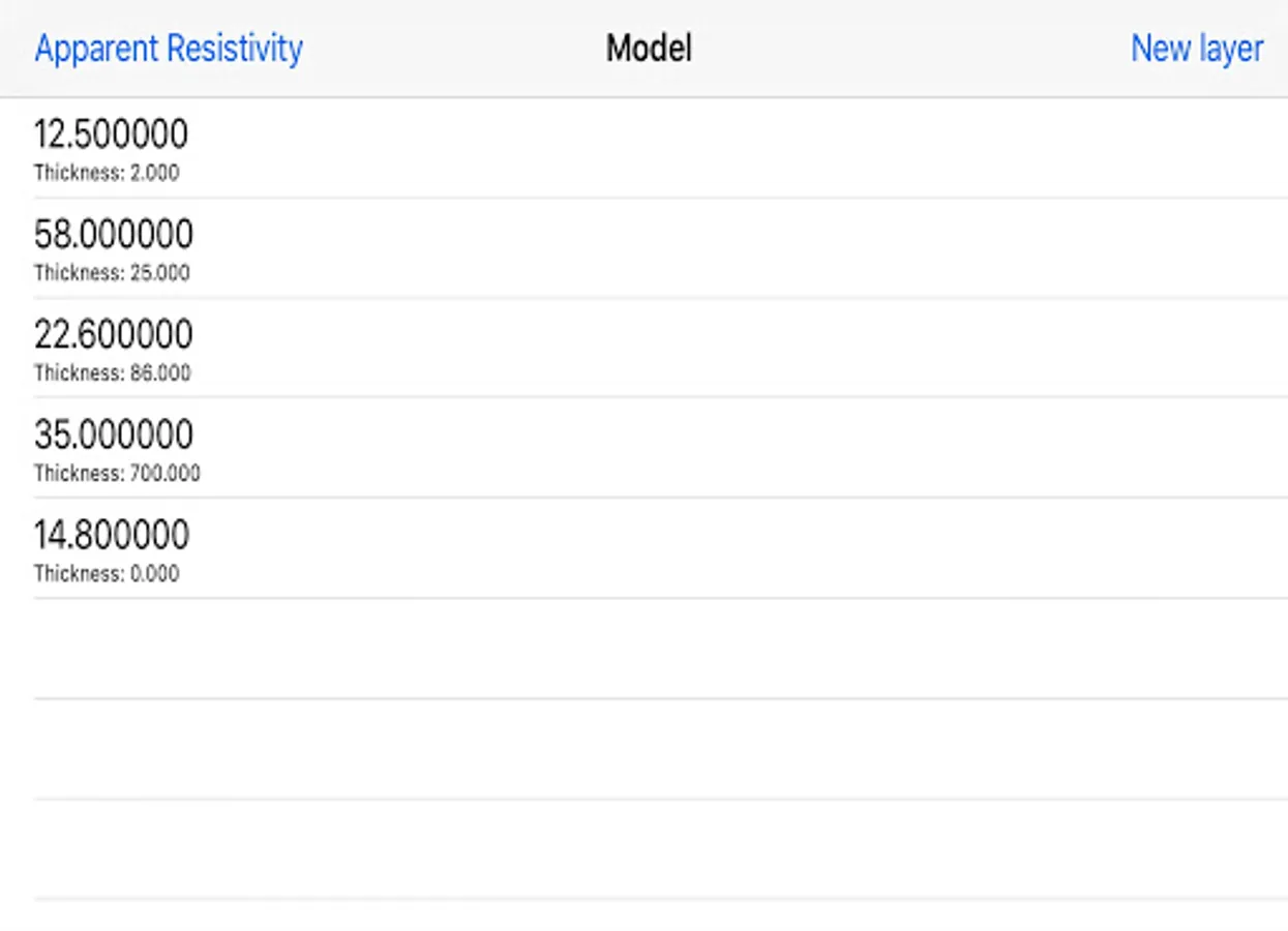 The theoretical terrain model is composed of a set of layers. You can add, remove and sort the layers of your theoretical model as desired. Each layer has two values: resistivity and thickness. You can add any number of layers to your model.