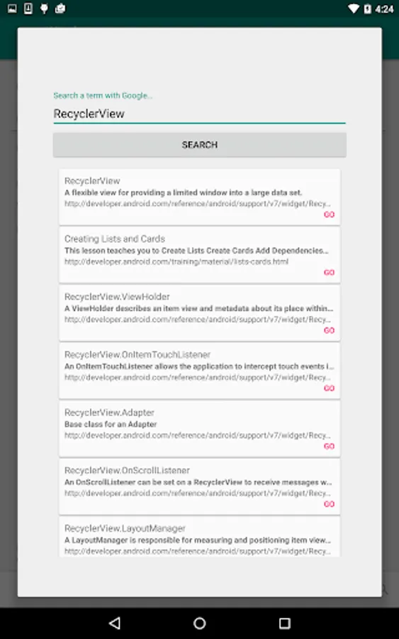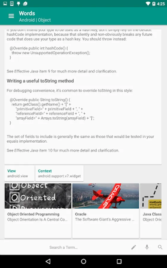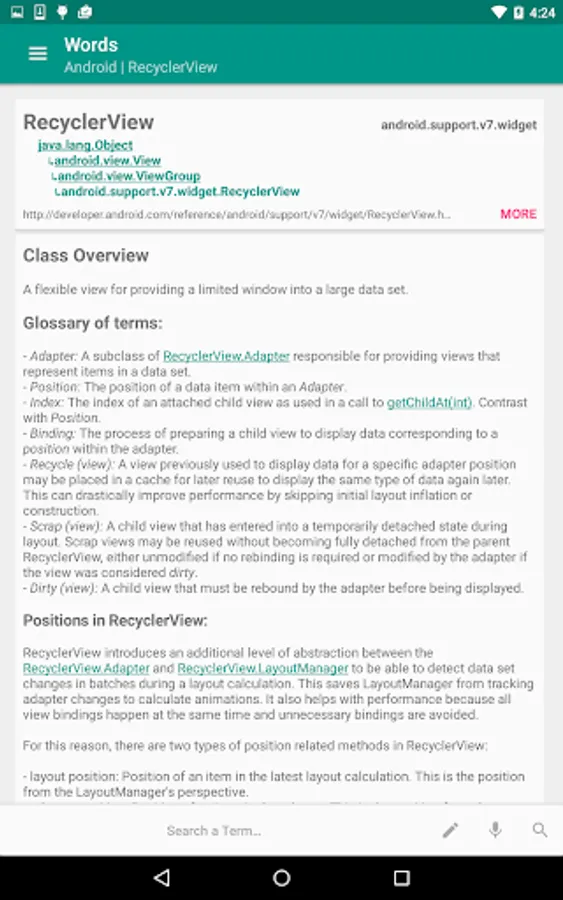 The version 1.0 contains more than 100 Android concepts and components, all double-checked with their principal and supported documentation if we don't have a term's data it will just send you to the main source.