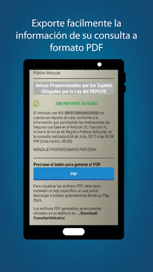 This application allows you to search through different criteria, such as plate, serial number or Vehicle Identification Number (VIN) -which is located on the board regularly or circulation-card as well as folio certificate of registration to the Public Registry Vehicular (REPUVE) -which is in the blue sticker located on the windshield.