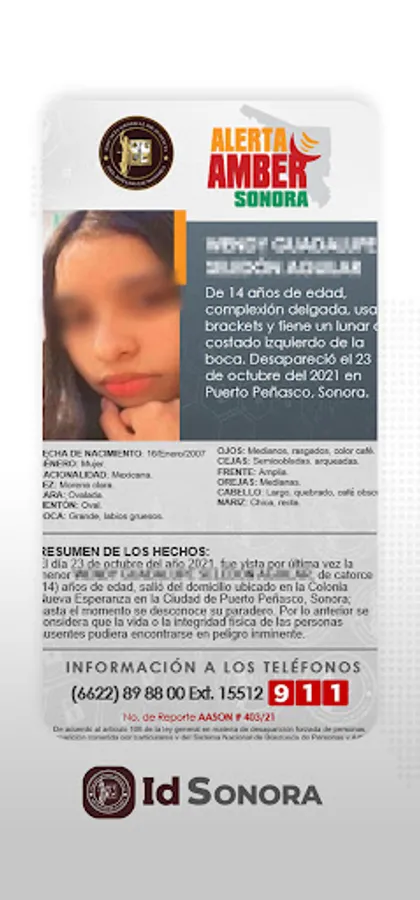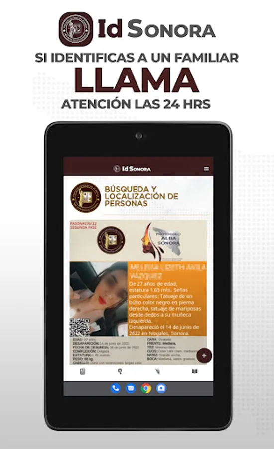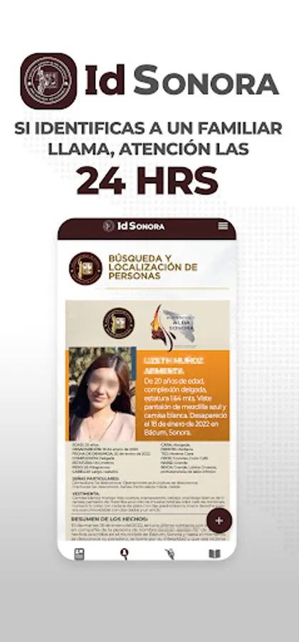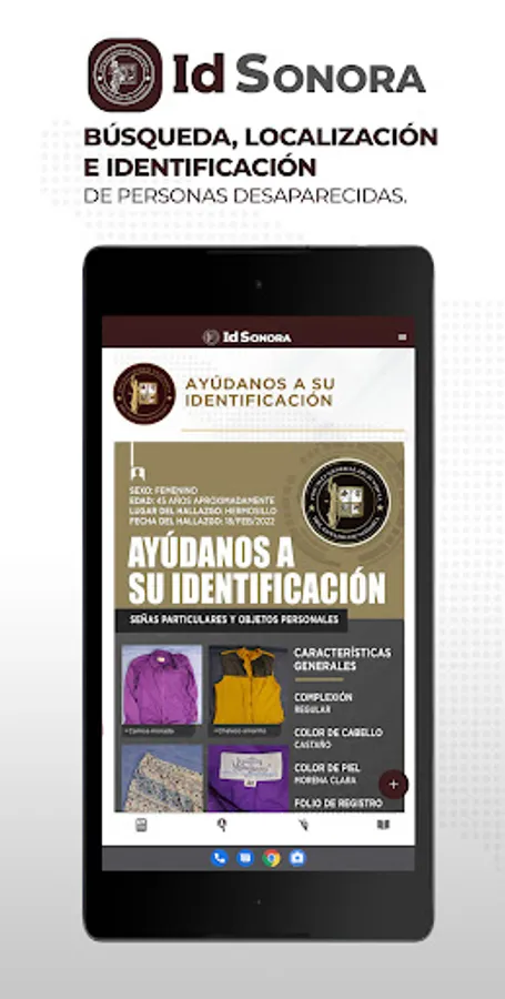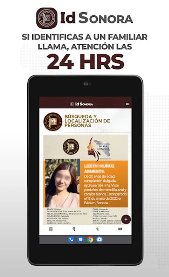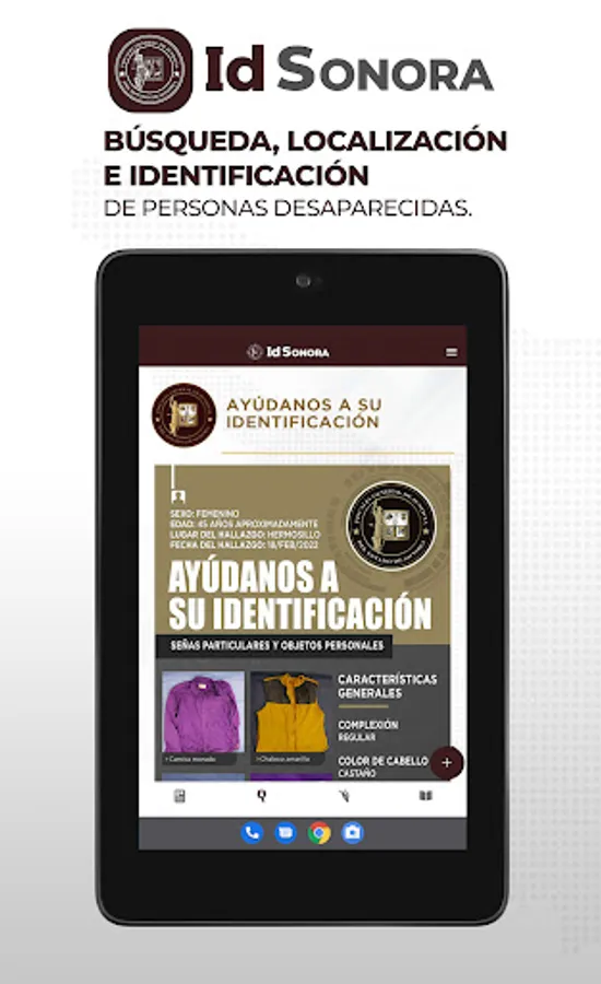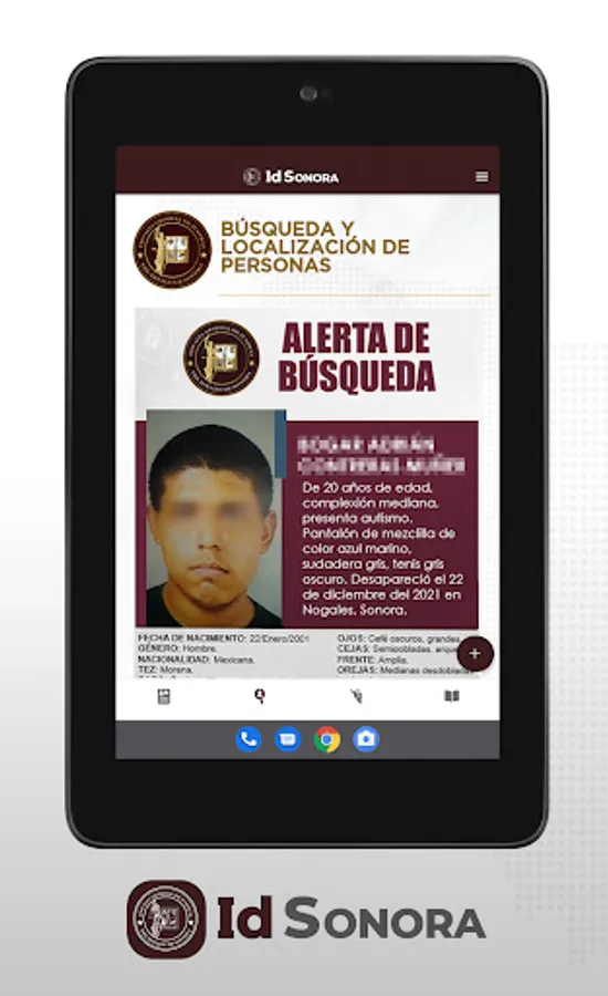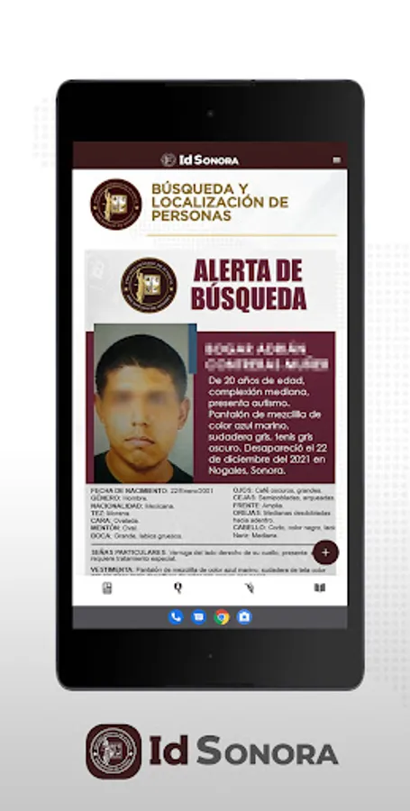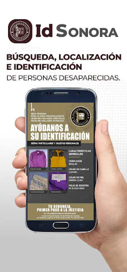 The Government of the State of Sonora and the Attorney General's Office, in compliance with a commitment to citizens in general and especially to citizen search groups, make the "IdSonora" application available in an effort to increase the identification of deceased persons and to locate lost and/or missing persons.