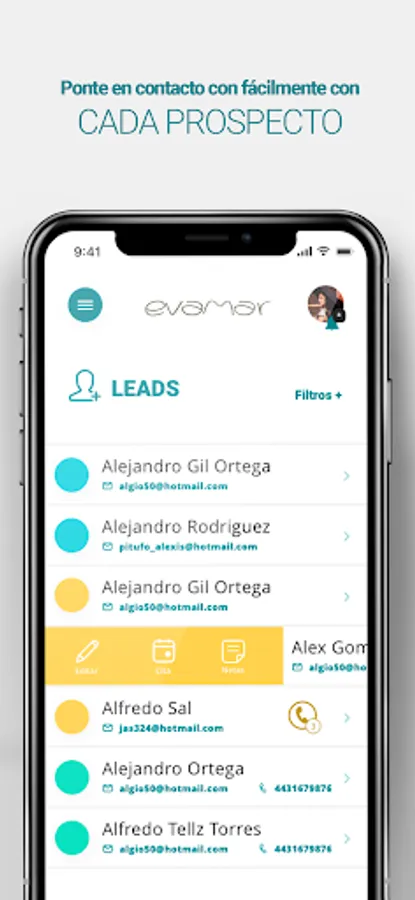 With the new Evamar Asesores app, manage your sales in a practical way, easily follow up on each assigned lead until it becomes a customer, manage your schedule and make the most of your day and quickly monitor your earnings.
