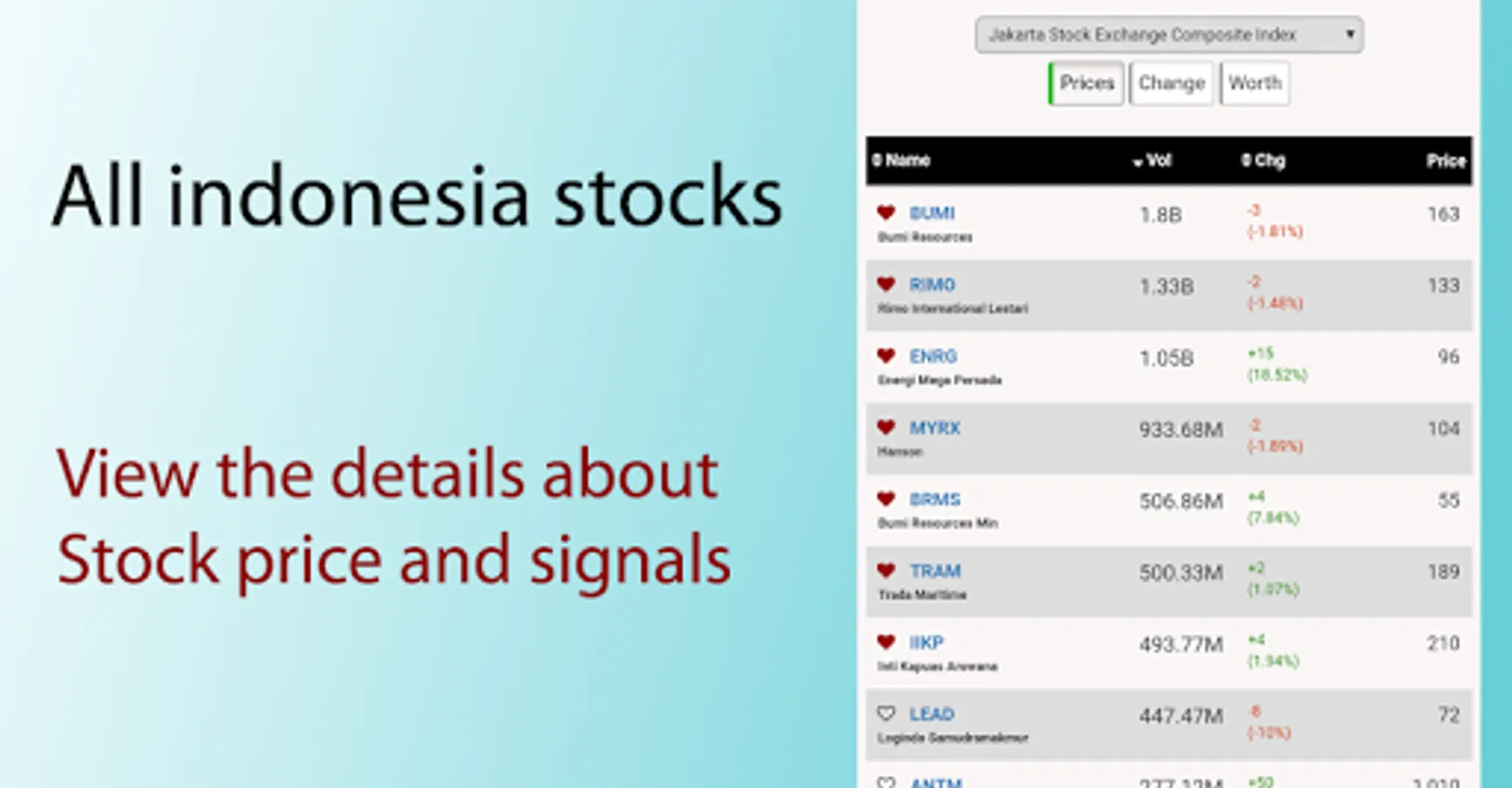 It is easy to manage and track your favorite company details, performance reports anytime and anywhere. Investment in IDX now becomes famous, Bursa efek Indonesia makes it easier for you to monitor the latest stock prices from the Jakarta stock exchange market. The app will display a list of companies with historical price and performance you can save stocks in your app fav list so that you often see in your favorite indonesian saham.