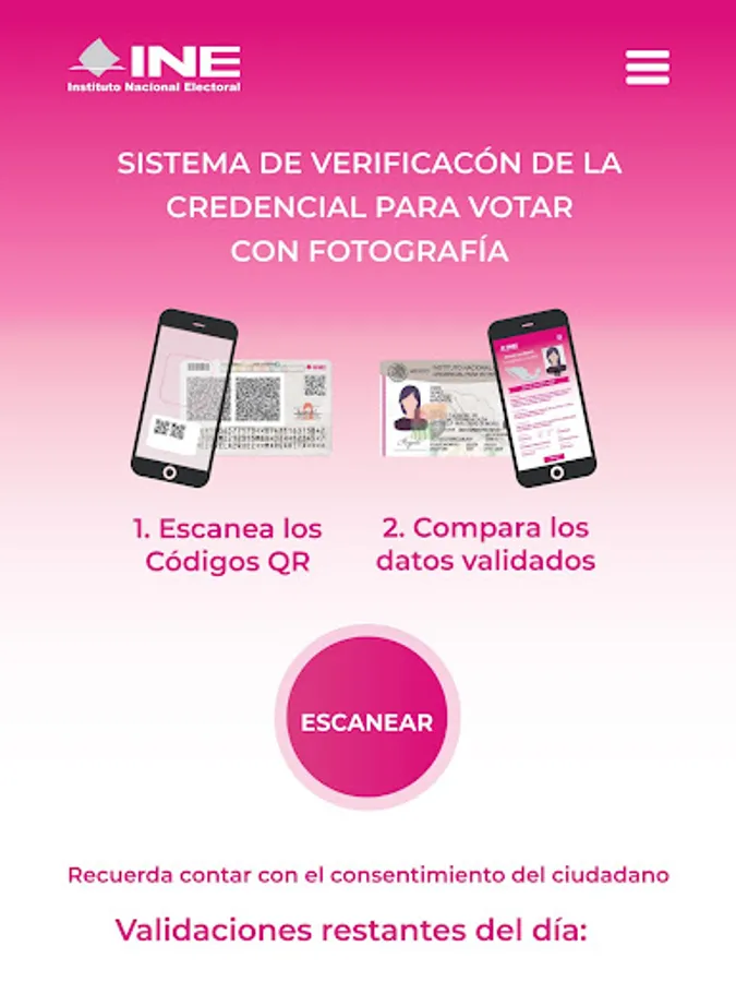 Valid INE-QR, is an app developed by the National Electoral Institute (INE), which allows citizens to read and verify the QR codes of the Voting Credential that have been issued as of December 2019, the correct reading and interpretation will show information contained in the Credential, which provides a reference that the Credential was issued by the INE.