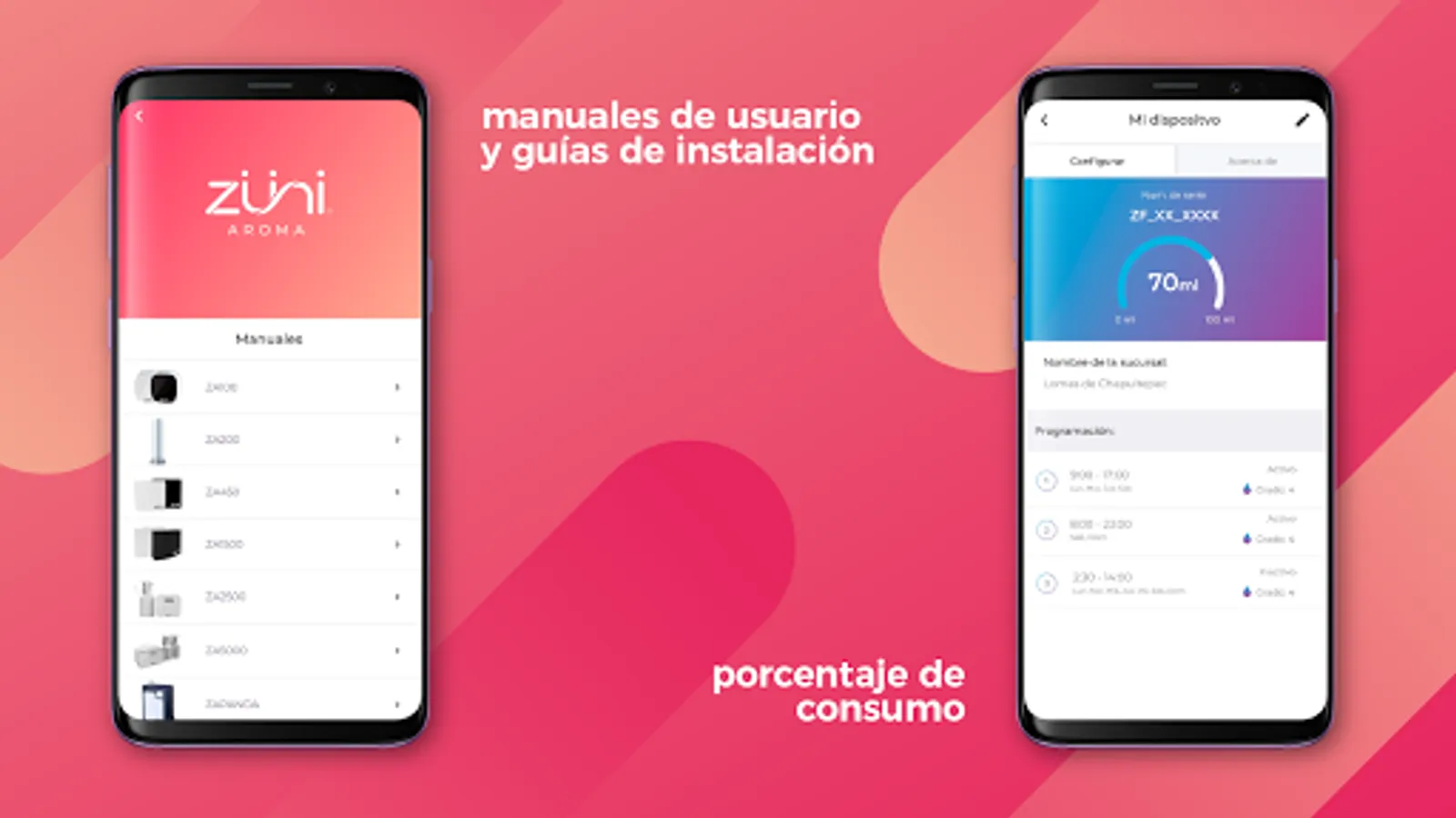 - Schedule work schedules, days of the week and the intensity levels of the aroma of your Zuni Aroma diffusers.