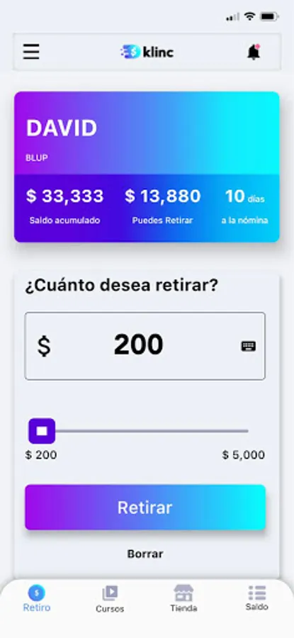 With Klinc, improve the financial well-being of your employees and increase the productivity of your organization. Klinc is a benefit where collaborators can have access to part of the salary already worked, without having to wait for the fortnight; This considerably reduces the financial stress that is the main factor of work stress.