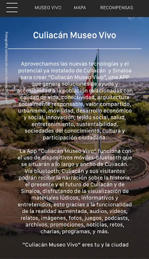 The App "Culiacán Live Museum" works with the use of mobile-bluetooth devices that will be located throughout Culiacán. Via bluetooth, Culiacán and its visitors can receive the story about the history, present and future of Culiacán and Sinaloa, enjoying the visualization of playful, informative and entertaining materials, this thanks to the functionality of augmented reality, audios, videos, stories, images, photos, games, podcasts, archives, promotions, news, challenges, talks, programs, and more.