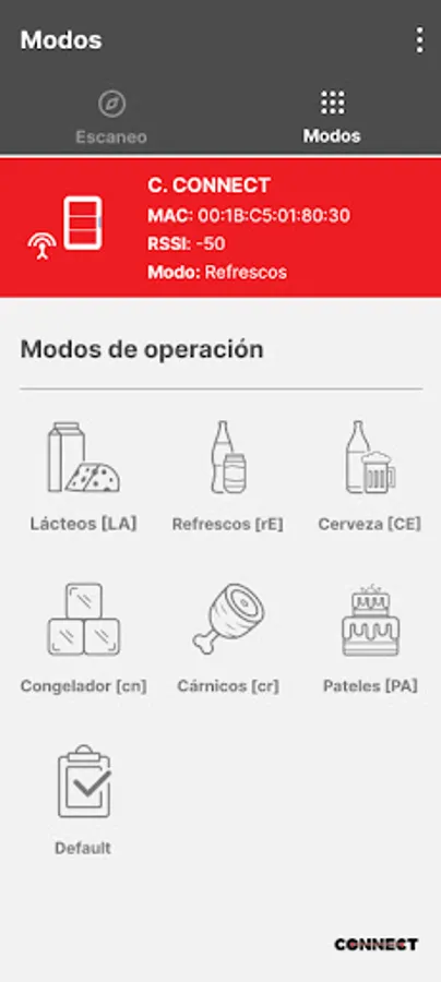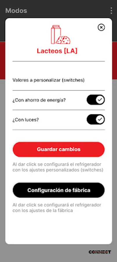 Realiza cambio de configuración de equipos connect de refrigeración, cambiando entre sus distintos modos de funcionamiento: pastelero, lácteos, cervecero, refresquero, carnicos.