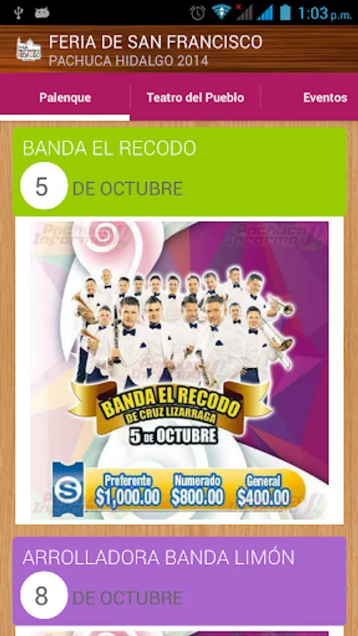 Wednesday, 8: Arrolladora Banda El Limón (Preferred: $ 1500, numbered: $ 1300, usually $ 600)
