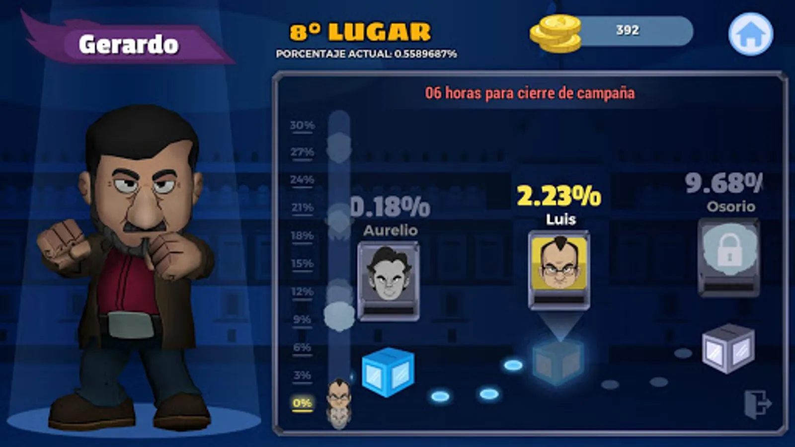 In campaign mode you choose a candidate to discuss with each of your opponents and win the campaign. You must remain in first place beating your opponents, accept challenges and earn points.
