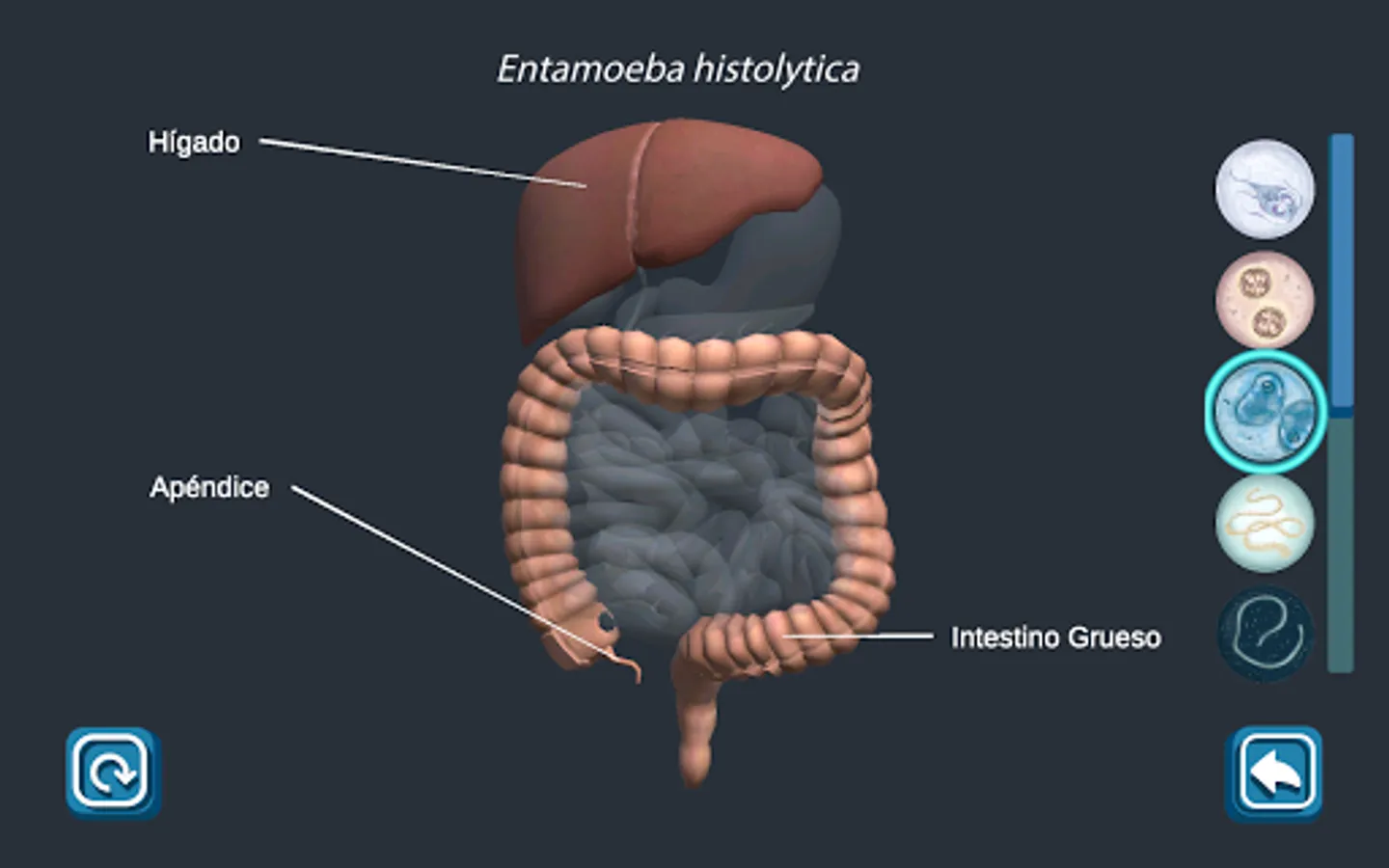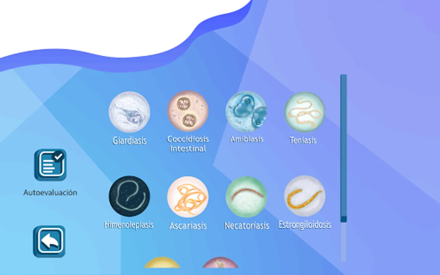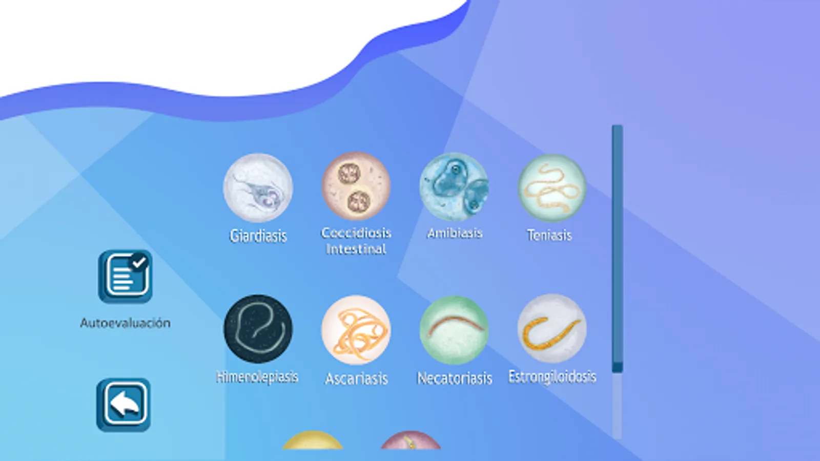 Enteropara-site is an application that contains multimedia didactic material for the study of parasitoses of medical importance that affect the small and large intestine that are included in the thematic unit of Parasitology of the subject of Microbiology and Parasitology of the second year of the Surgeon of the Faculty of Medicine of the UNAM. It includes information regarding the generalities of parasitosis, transmission mechanisms, clinical symptoms, diagnosis and treatment. This app should only be used as a study tool to reinforce the knowledge acquired in class since the information is only a summary of the chair of each parasitosis. The topics included in the app are: Giardiasis, Intestinal Coccidiosis, Amebiasis, Taeniasis, Hymenolepiasis, Ascariasis, Necatoriasis, Strongyloidosis, Trichuriasis and Enterobiasis. The user must understand that the content presented in this application is only informative and designed for medical students, so a doctor should be consulted when any of these conditions is suffered.