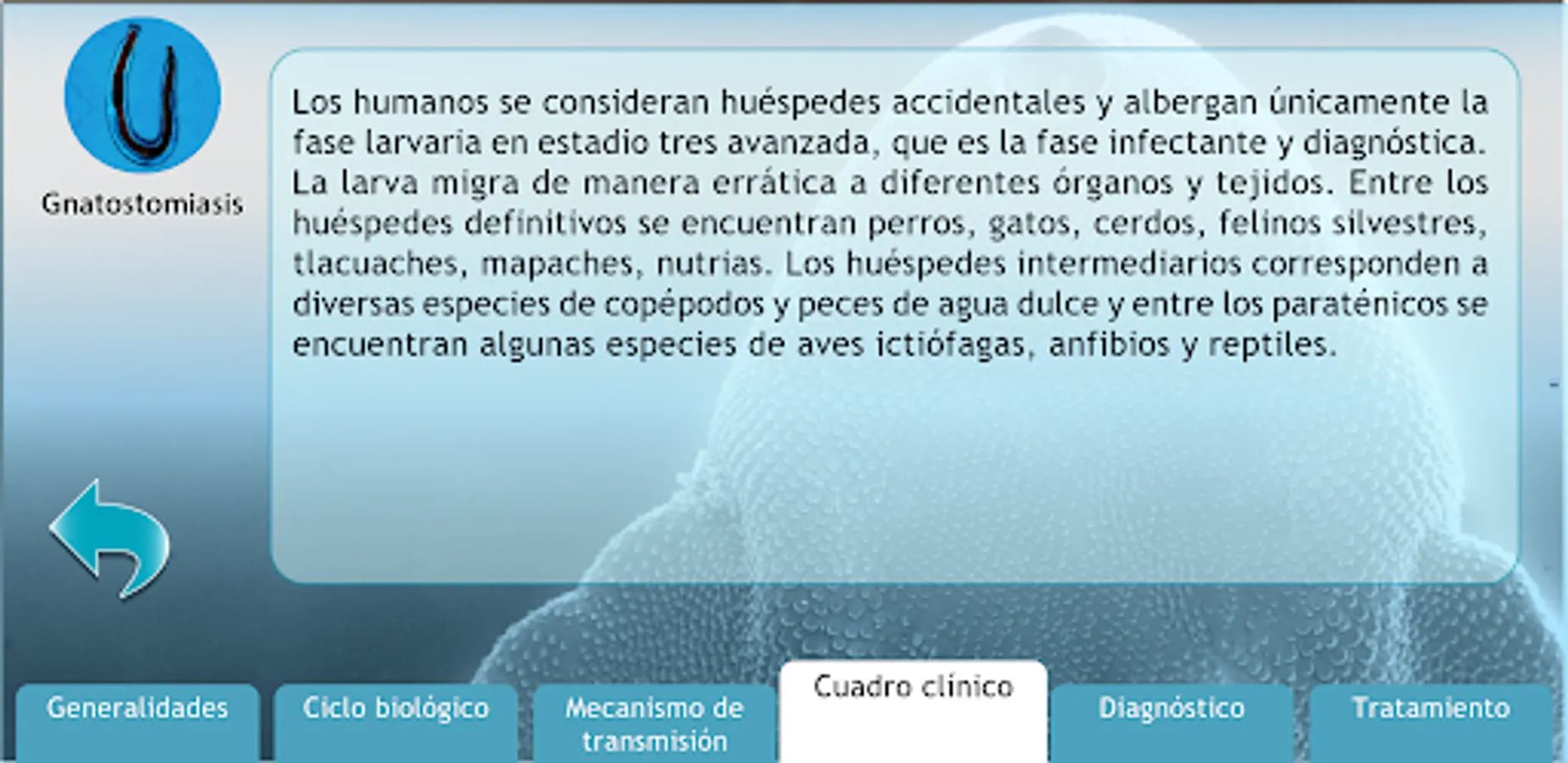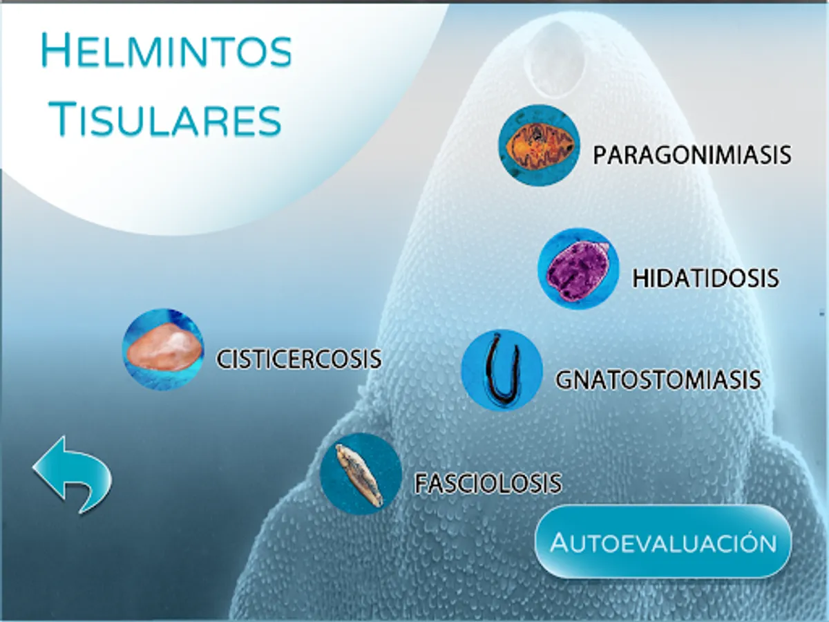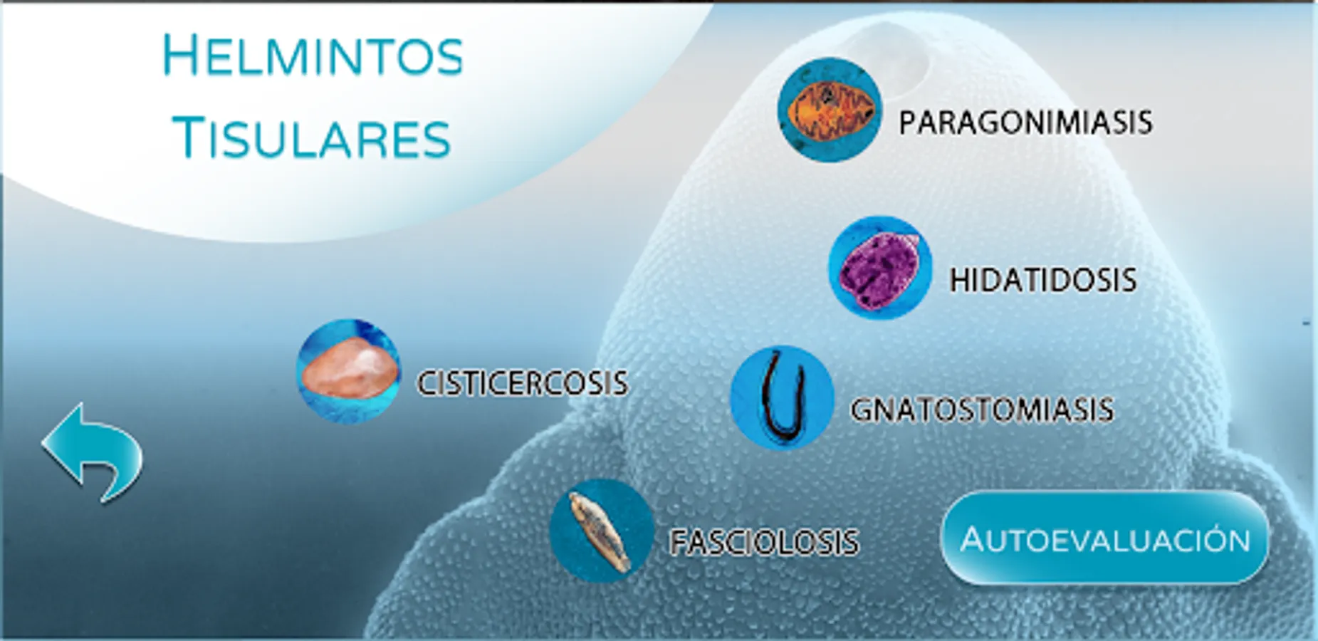 Tissue helminths is an application that contains multimedia didactic material for the study of parasitosis of medical importance that affect various organs and tissues that are included in the Parasitology thematic unit of the Microbiology and Parasitology subject of the second year of the Surgeon career of the Faculty of Medicine of the UNAM. It includes information referring to the generalities of parasitosis, transmission mechanisms, clinical picture, diagnosis and treatment. This app should only be used as a study tool to reinforce the knowledge acquired in class since the information is only a summary of the course of each parasitosis. The topics included in the app are: Cysticercosis, Hydatidosis, Fasciolosis, Paragonimiasis and Gnathostomiasis. The user must understand that the content presented in this application is for informational purposes only and designed for medical students, so a doctor should be consulted when suffering from any of these conditions.