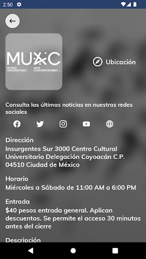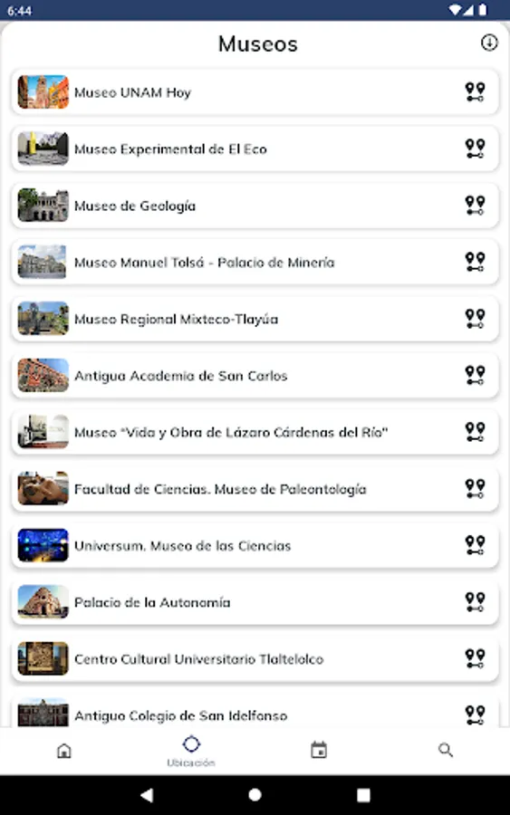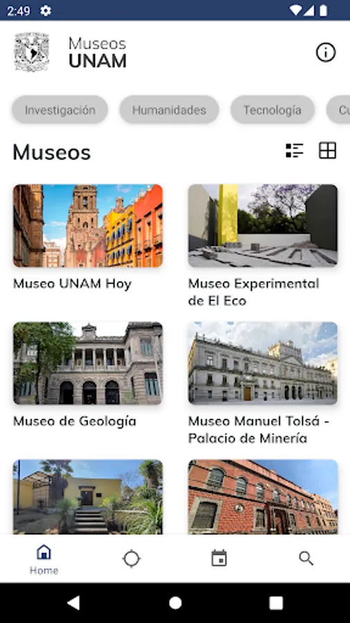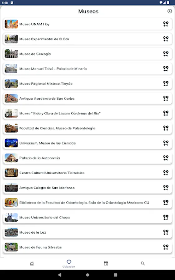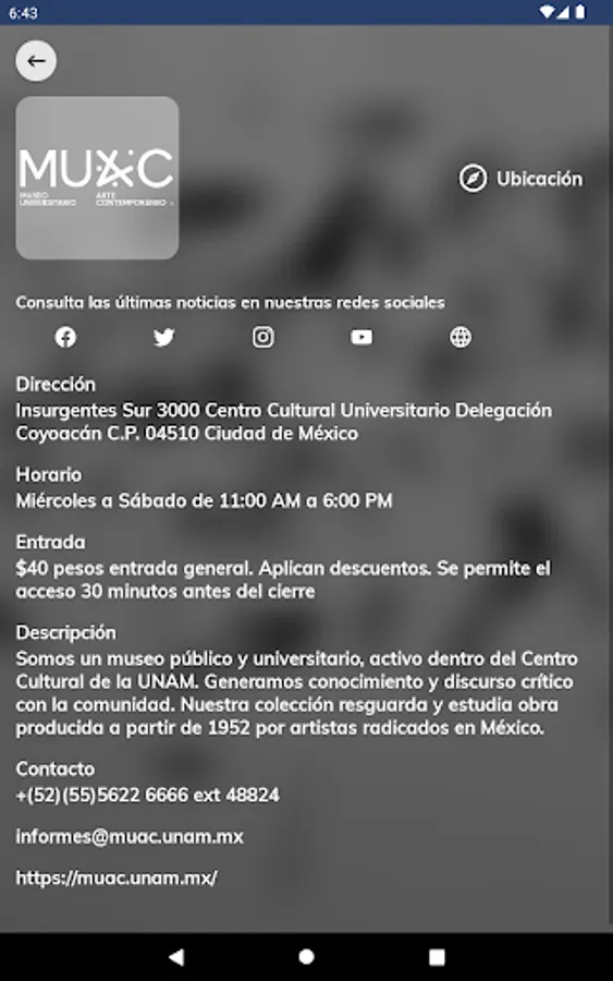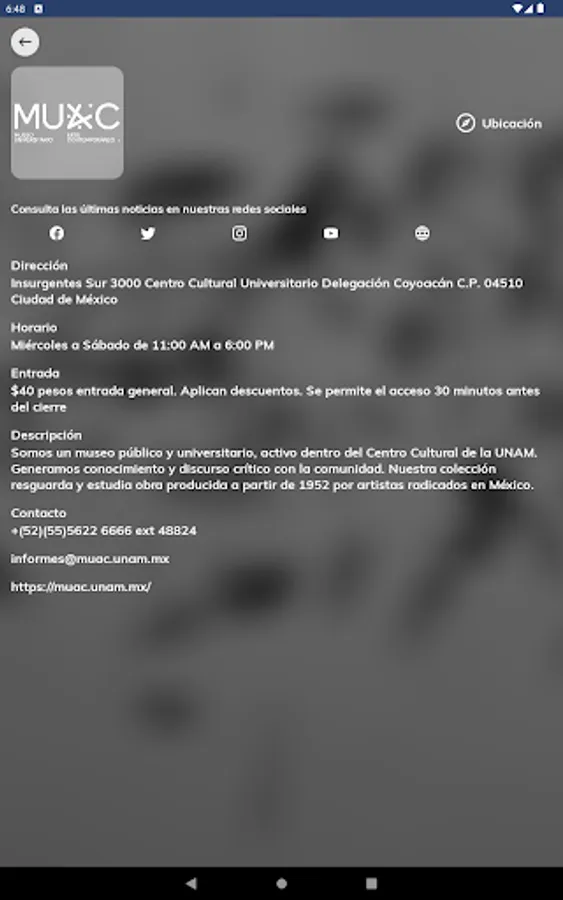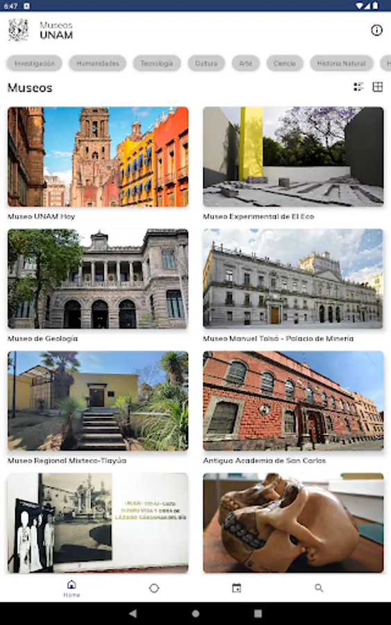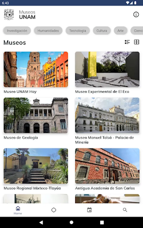 This university application has been designed and managed by the Secretariat of Institutional Development (SDI) of the National Autonomous University of Mexico (UNAM). The modules that make up this application have been created to provide useful university cultural information that can be consulted from a mobile device (cell phone and digital tablet), connected to the Internet, such as information on museums, visual arts, music, theater. , dance, cultural, academic venues, among others, offered by the different and diverse academic entities and dependencies that make up the UNAM.