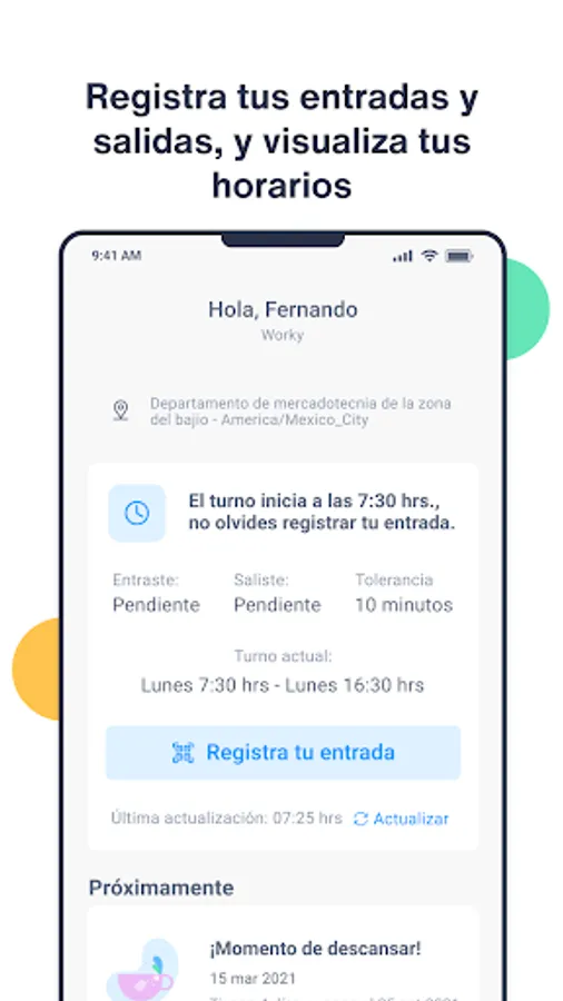 If it is implemented in your company, register your entrance, exit and lunch time easily with a QR code or by tapping on the registration button. Add photo comments when checking in or out. In the Assistance Management section, it resolves incidents generated by time clock records.