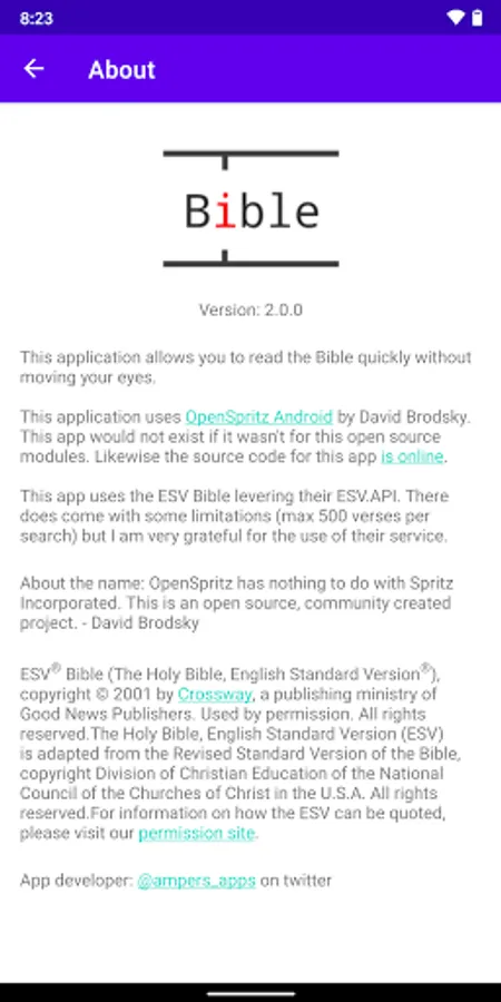 This application uses the OpenSpritz Android by David Brodsky. This app would not exist if it wasn't for this open source module. Likewise, the source code for this app is online: https://bitbucket.org/ampers_apps/openspritz-bible-android-app