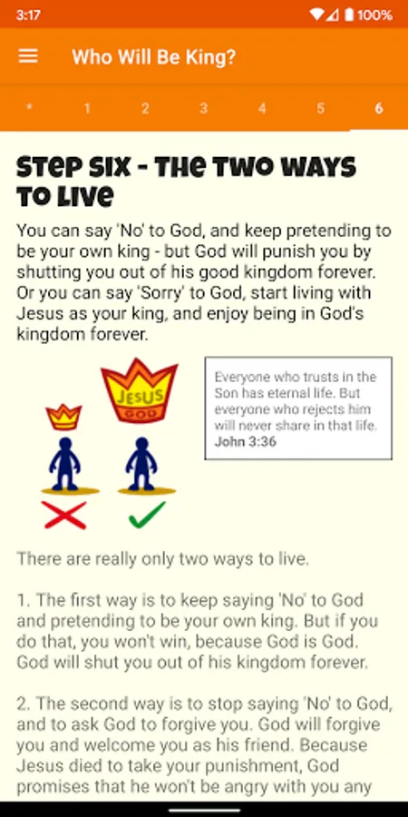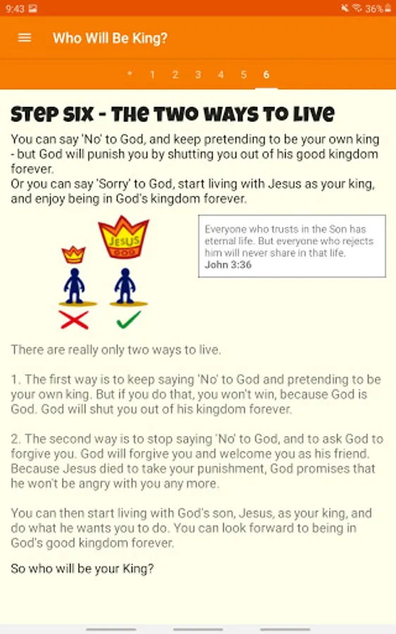 Who will be king? is a simplified version of Two Ways to Live that was designed for kids aged 7-11. It presents the Christian gospel in six simple points in an easy to understand way.