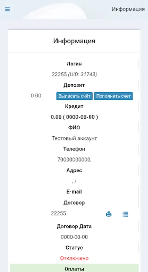 All the functions of your personal account are implemented here. In the free mobile application, you can: