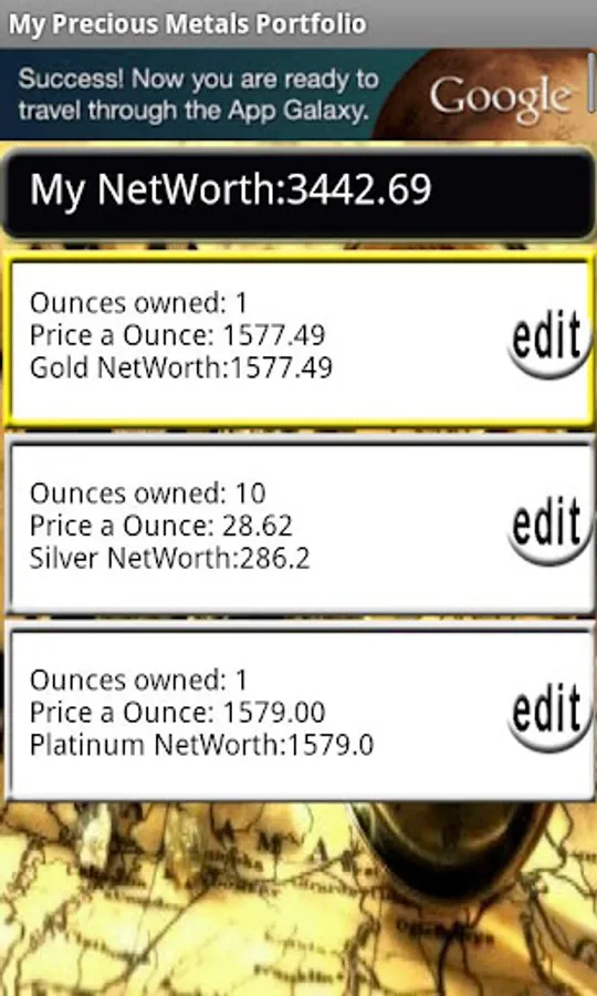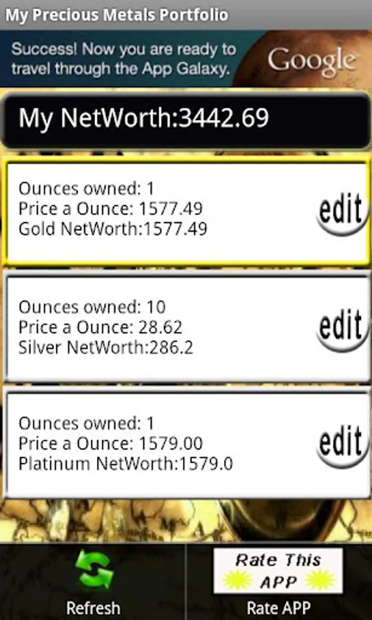 With this app you will always have the latest spot prices of gold ,silver and platinum .It also calculates your net worth based on the amount of ounces you own.And gives you the net worth for each individual category gold ,silver and platinum.