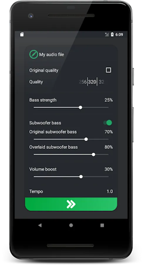Settings for music editing in the “Bass Editor: Boost Bass and Save Music” app: