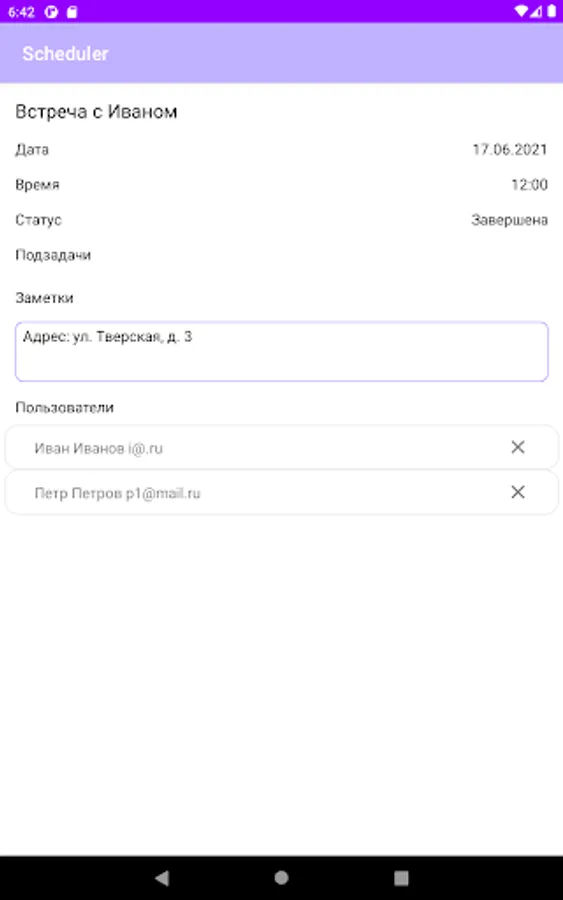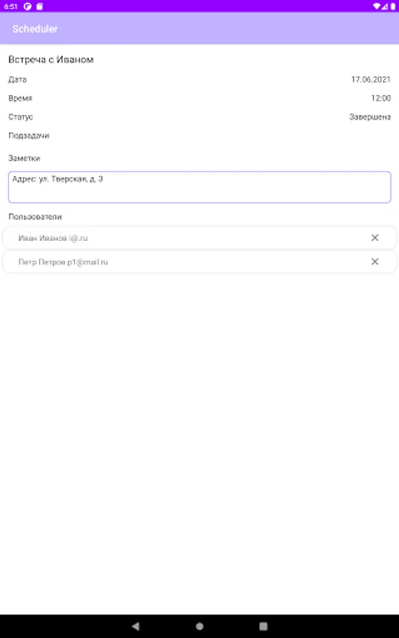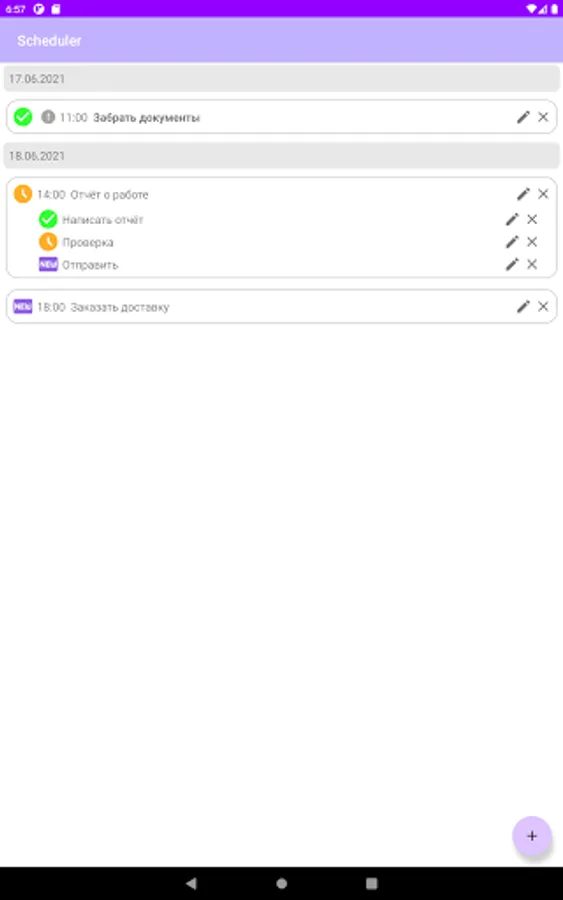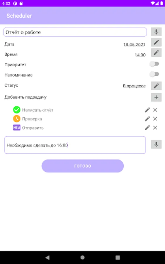 The Scheduler application allows you to create tasks and mark their completion. Tasks can be both individual and joint. Share or assign tasks to other users and track their progress. The app is intended to be used by small groups of people, such as friends, family, or work colleagues.