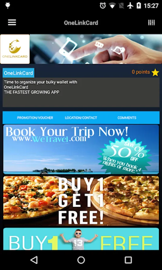 OneLinkCard Android app gathers all your loyalty cards, coupons, and latest promotion on your phone. No more plastic cards, paper ads, no more forgotten or lost cards. Slim down your wallet and save more with great deals!