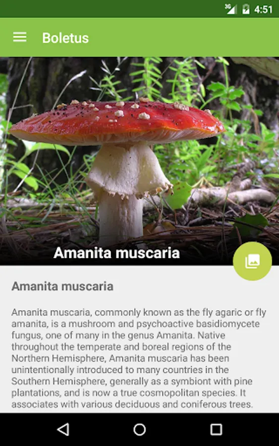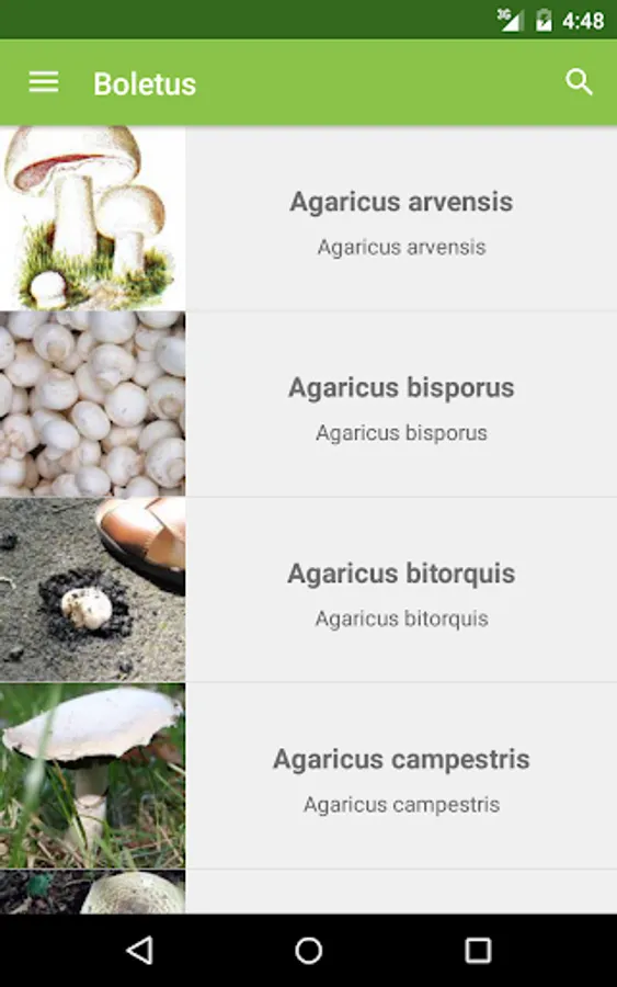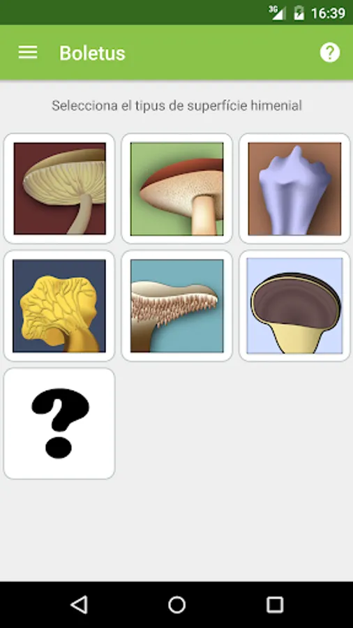 When you find an unknown mushroom in the nature, Boletus will ask different questions about the mushroom found -foot color, cap shape, existence of a ring, etc-. After that, the it will show a list of mushrooms that match your awnsers, presenting its name, description, photos and more.