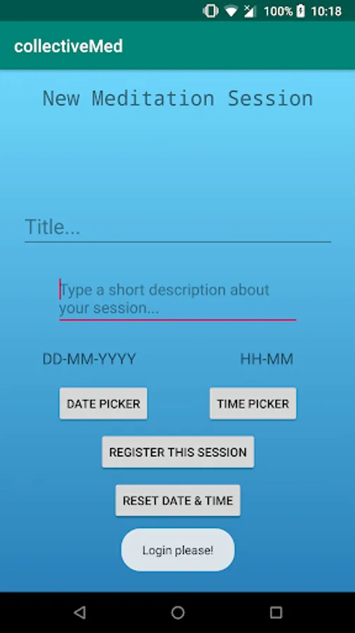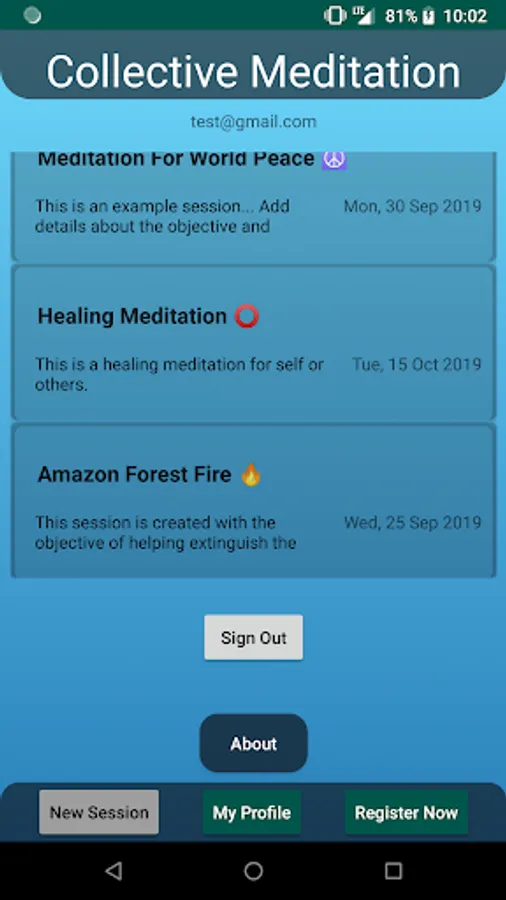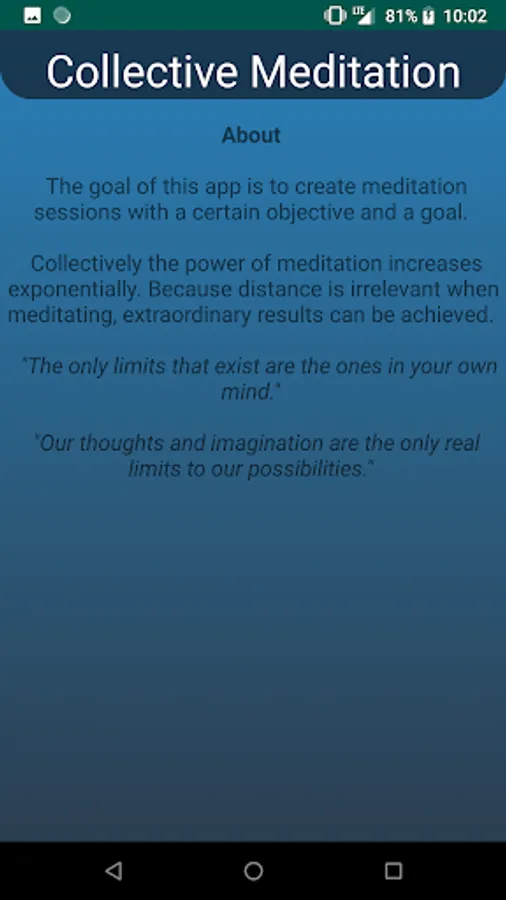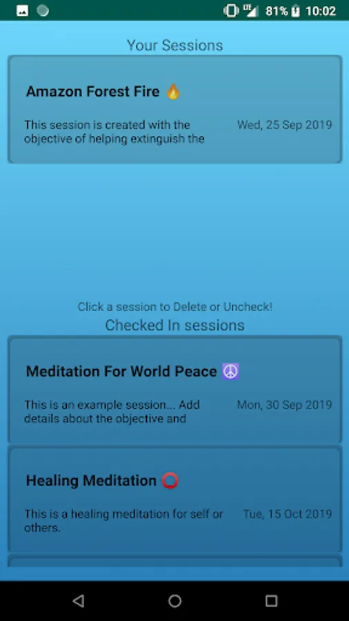 A user can create meditation sessions and allow other people to check-in. Various sessions can be created with an objective. Each session is about 30-40 minutes long.