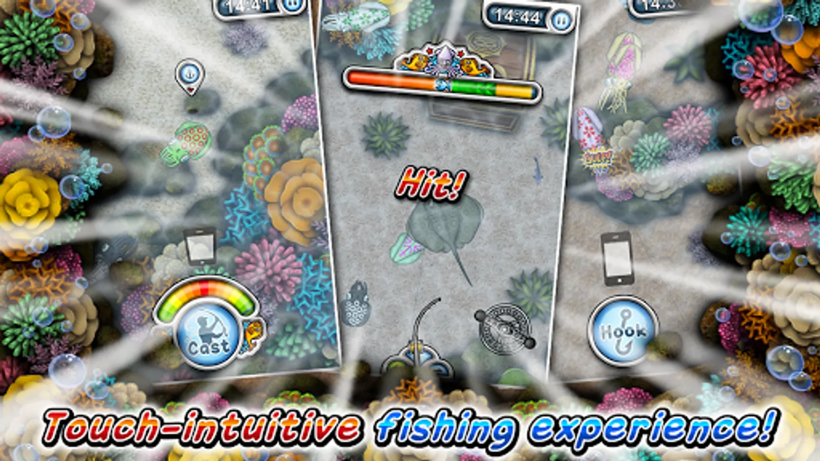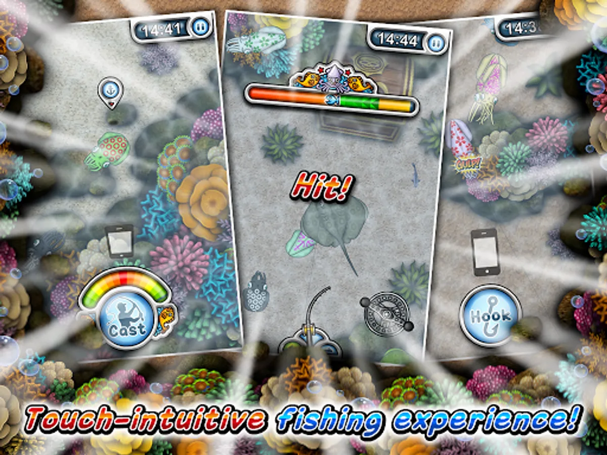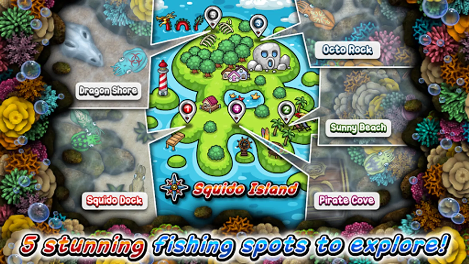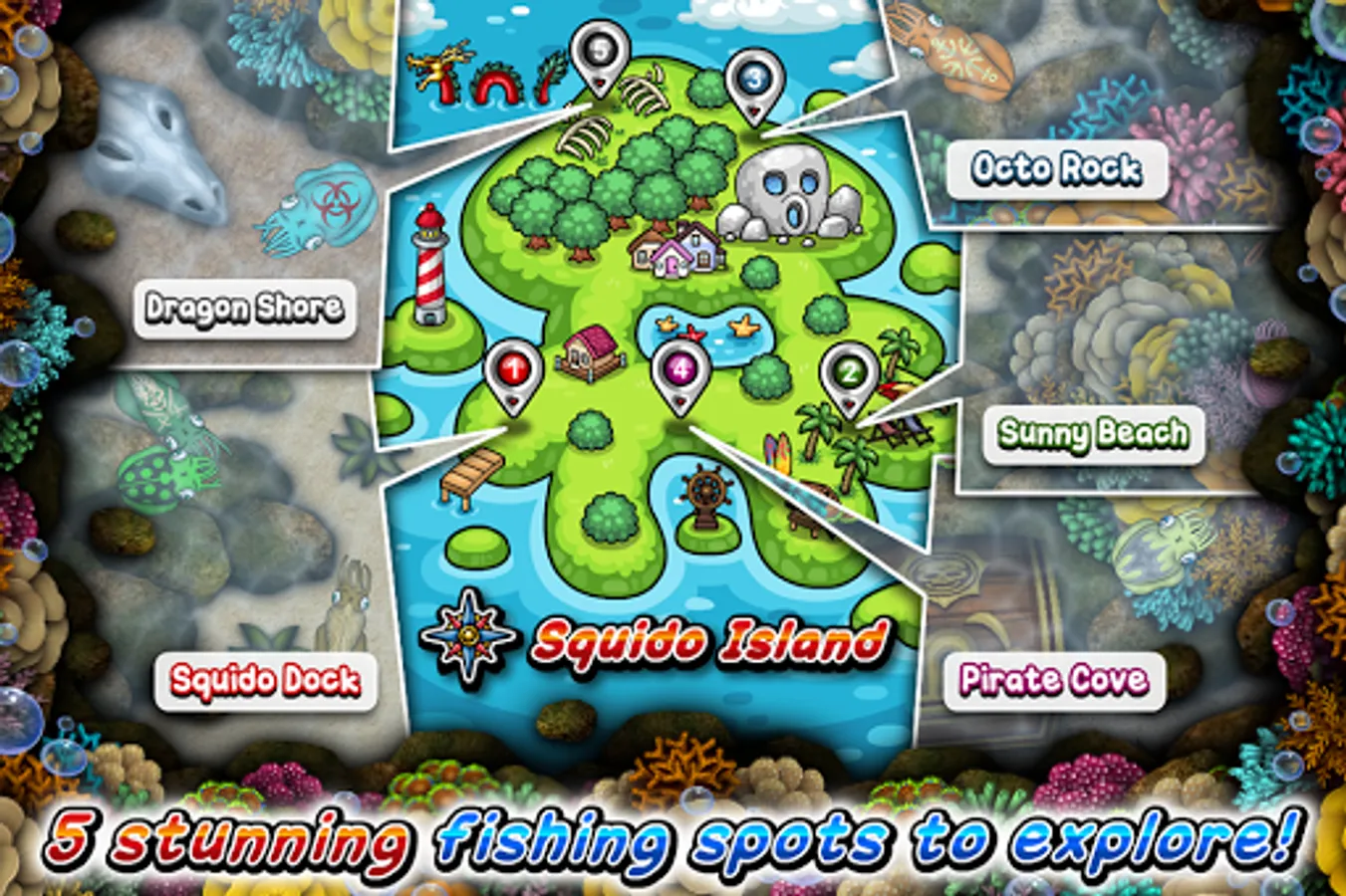 • Explore 5 fishing spots with stunning underwater reef scenes.