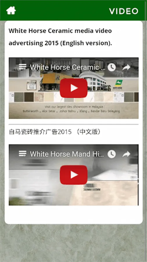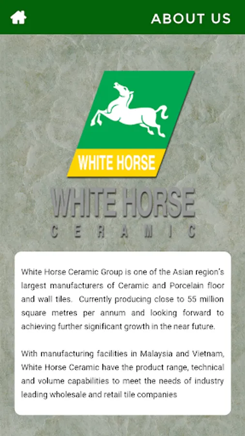 White Horse Ceramic App lets you quickly and easily to view our latest ceramic wall tiles, ceramic floor tiles and porcelain tiles series. All of them are available in an extensive range of texture surface, patterns and styles to fit in with your tastes and requirements.