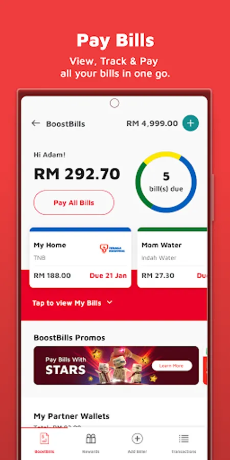 Settle all your bill payments easily - postpaid, internet, electricity, water, TV, all from the Boost app. With our 3 features – AutoBills, MultiBills, and ViewBills – you can now set auto-recurring payments, pay multiple bills in one go, and view consolidated payment information. All you need to do is key in your account details and save them for your next payment. You can earn Stars for every Ringgit spent and use them to enjoy instant discounts on your bills.