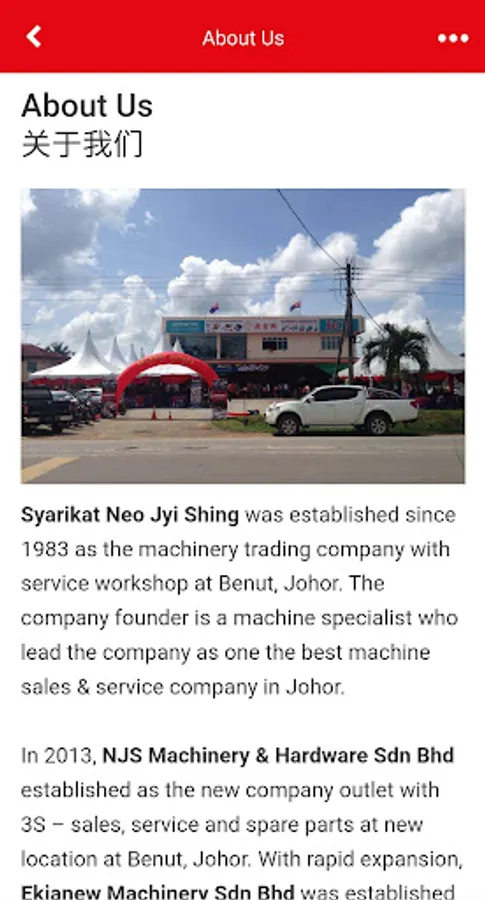 In 2013, NJS Machinery & Hardware Sdn Bhd established as the new company outlet with 3S – sales, service and spare parts at new location at Benut, Johor. With rapid expansion, Ekianew Machinery Sdn Bhd was established in 2016 as the machinery wholesale distributor for Johor region.