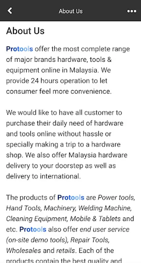 The products of Protools are Power tools, Hand Tools, Machinery, Welding Machine, Cleaning Equipment, Mobile & Tablets and etc. Protools also offer end user service (on-site demo tools), Repair Tools, Wholesales and retails. Each of the products contain the best quality and high value to satisfy consumer’s needs.