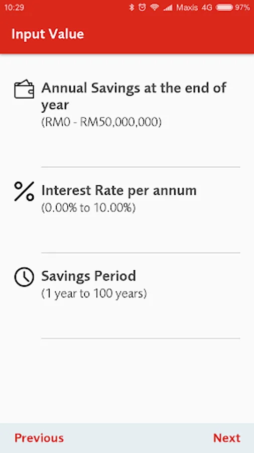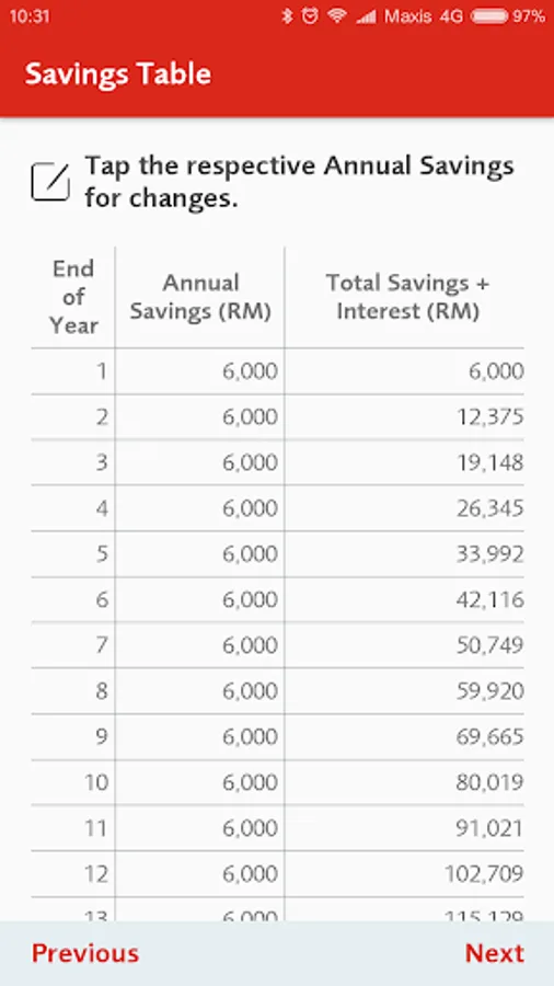 Save with PRU is a simple financial calculator that helps you to visualize how much you can get from setting some savings aside every year. All you need to do is put in how much you want to save every year, the expected interest rate on your savings, the duration you wish to save and when you wish to begin saving.