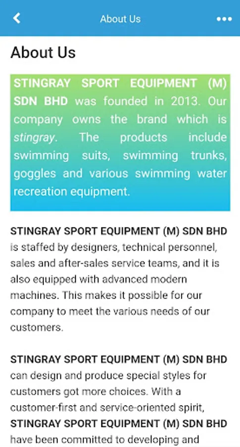 STINGRAY SPORT EQUIPMENT (M) SDN BHD was founded in 2013. Our company owns the brand which is stingray. The products include swimming suits, swimming trunks, goggles and various swimming water recreation equipment.