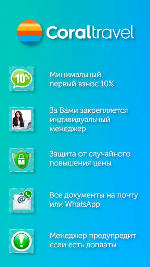* If you have any difficulties selecting tours, you can call us and our tourism managers will help you buy sea trips or last-minute tours from Moscow. * the application contains sea tours and trips to both popular destinations and exotic places. The tour search program will help you buy a tour online. Book tours and trips to Thailand, Vietnam, Cuba, Tunisia, Cyprus, the Dominican Republic, trips to Turkey, the Maldives, hotels in Crimea, as well as to the islands of Goa or Mauritius, etc.; * all tour operators offer both regular tours for a beach holiday and your travel blog, as well as active ones for lovers of interesting entertainment. The application also finds packages and tours for wellness, wedding, shopping and yoga tours. The Coral Travel application presents all tour operators and you can buy tours online and choose what you like best. Coral helps you make your dream come true and organize your trip. Here are last minute tours for the coming weeks and months with big discounts. For example, discounts of up to 50% are provided for early bookings. You can book your favorite tours and last minute trips either directly in the application, or on the travel agency website, or in the office. The travel agency Coral Travel searches for tours using an application that offers travel packages from leading Russian tour operators. The program on your smartphone can easily find profitable trips online. You don’t have to worry about organizing your vacation, because... The application searches for tours only from tour operators that have been proven over the years. Tourism is our profession. Your holiday is in good hands with Coral travel travel agency.