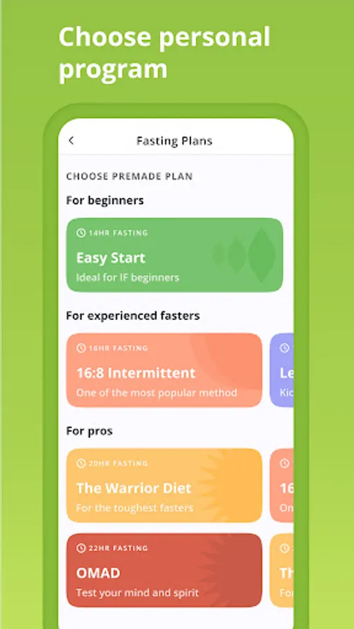 - Range of intermittent fasting programs to try out, including Easy Start, 16:8 Intermittent, Leangains+, OMAD, and more. My Fasting Diet is perfect for beginners and pros alike. Just find the plan to suit your body and start a fasting timer.