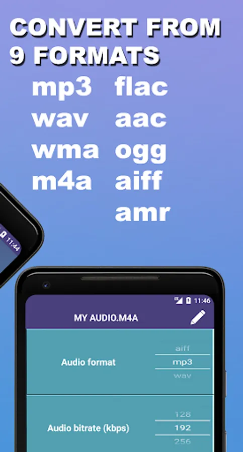 Audio converter for Android “Audio Converter MP3 WAV WMA FLAC AMR AAC OGG etc.” lets you convert 9 audio formats: MP3, WMA, OGG, M4A, WAV, FLAC, AAC, AIFF, AMR.