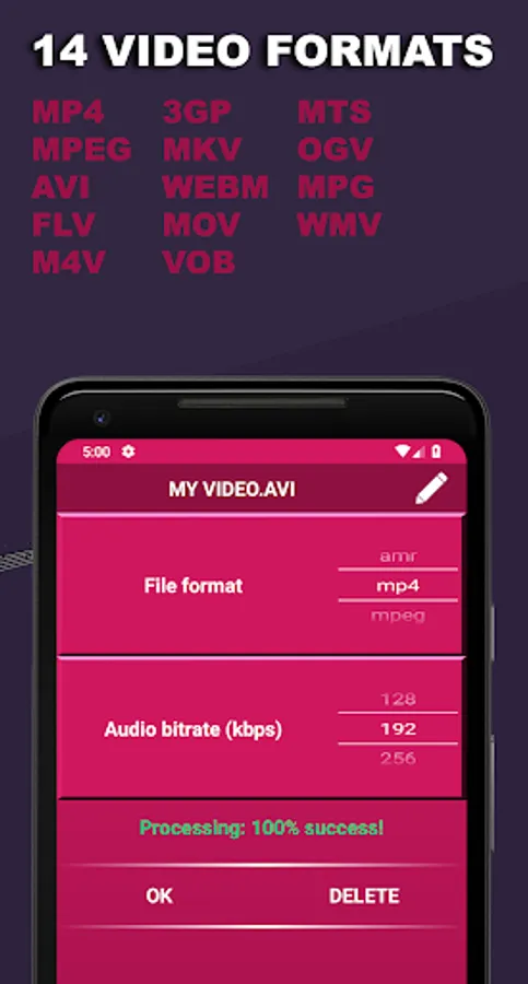 You can convert any video to MP4, AVI, MOV, MKV, FLV, WEBM, VOB, MTS, MPG, MPEG, WMV, M4V, OGV, convert 3GP to MP4.