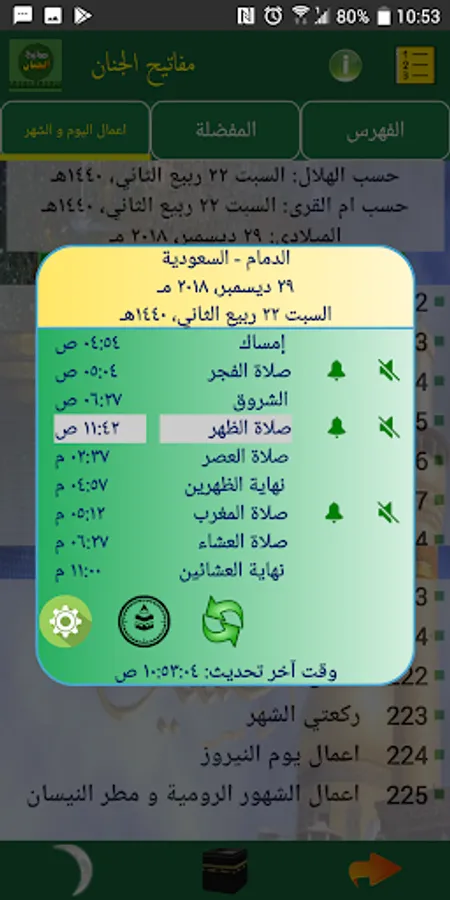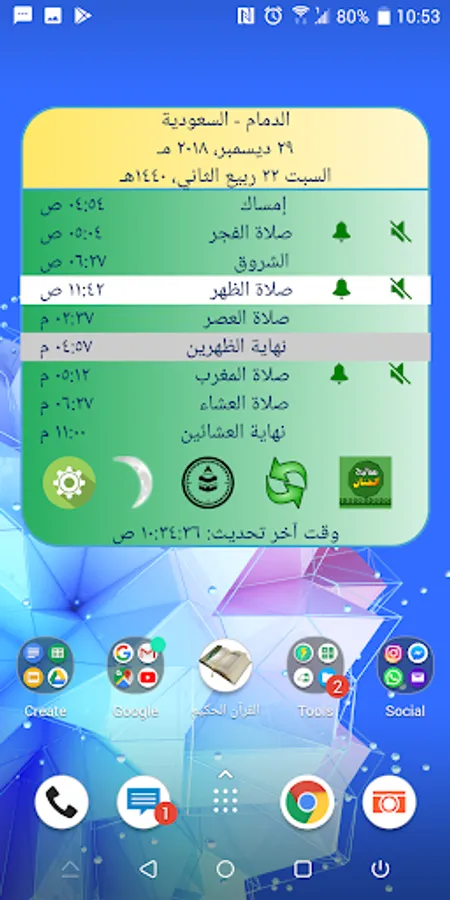 # Settings icon to set the settings for the prayer calendar (widget) such as modifying the lunar Hijri date, modifying the prayer times, activating mute sounds during the performance of the prayer for a specific period, activating the call to prayer and setting the muezzin and its duration, activating the alarm before the prayer, activating the night prayer alarm