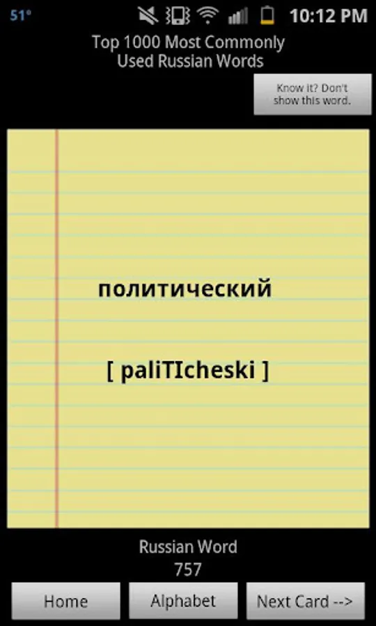This is a 5-in-1 Russian language learning tool for free. Easy Russian has a dictionary search, categorized travel words and phrases for men and women, flashcards of the top 1000 most frequently used words, a word quiz game, and a knowledge test of fluency. Flashcards include English pronunciation equivalent for easy self-study. Plus, an alphabet reference is used to help with basic Russian words and phrases. Categories include: